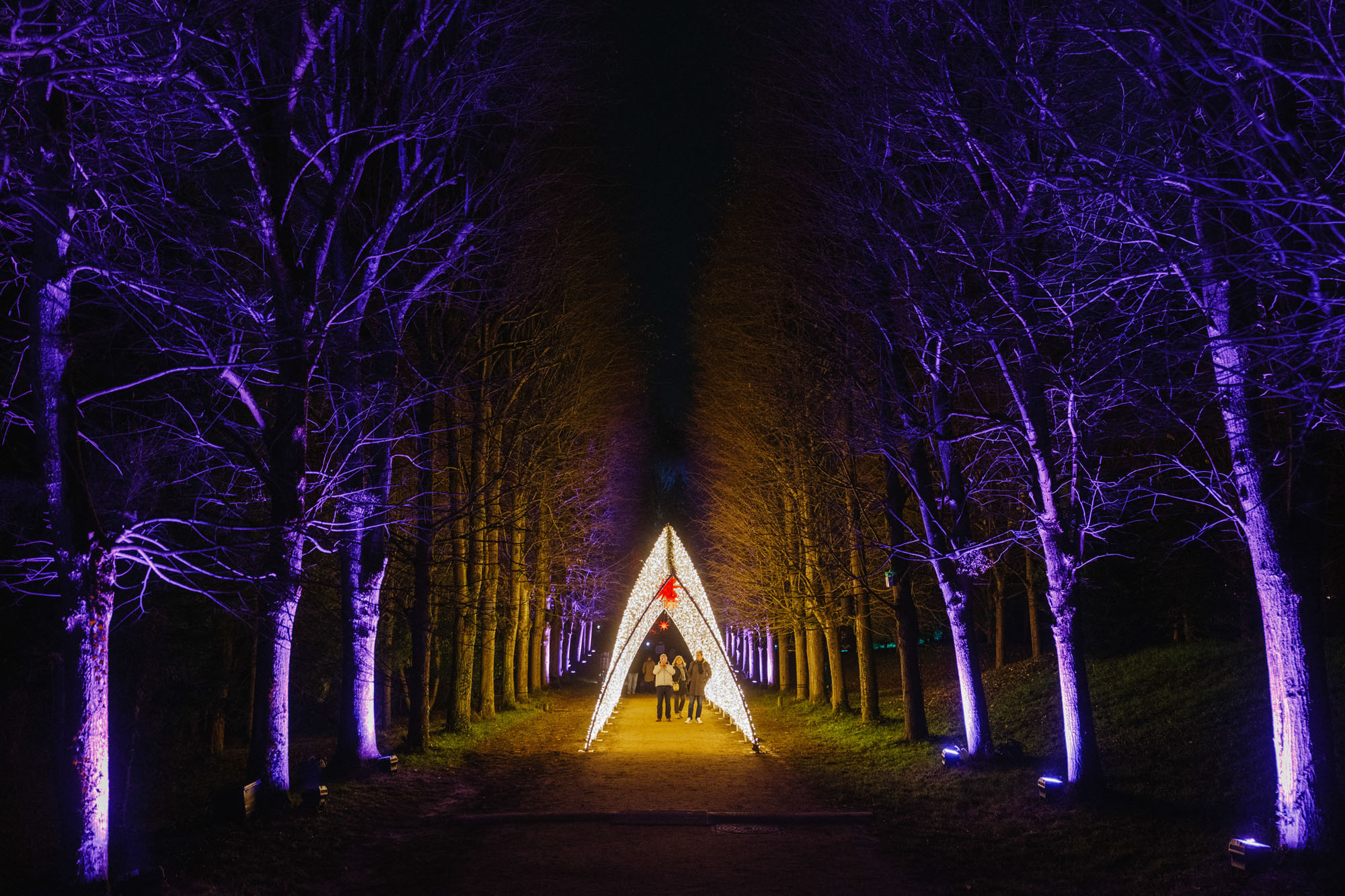 Visitors walk through a light tunnel during the “Lumieres-en-Seine” holiday lights show, at the National Estate of Saint-Cloud in Saint-Cloud, near Paris on December 12, 2024. (Photo by Dimitar Dilkoff/AFP Photo)