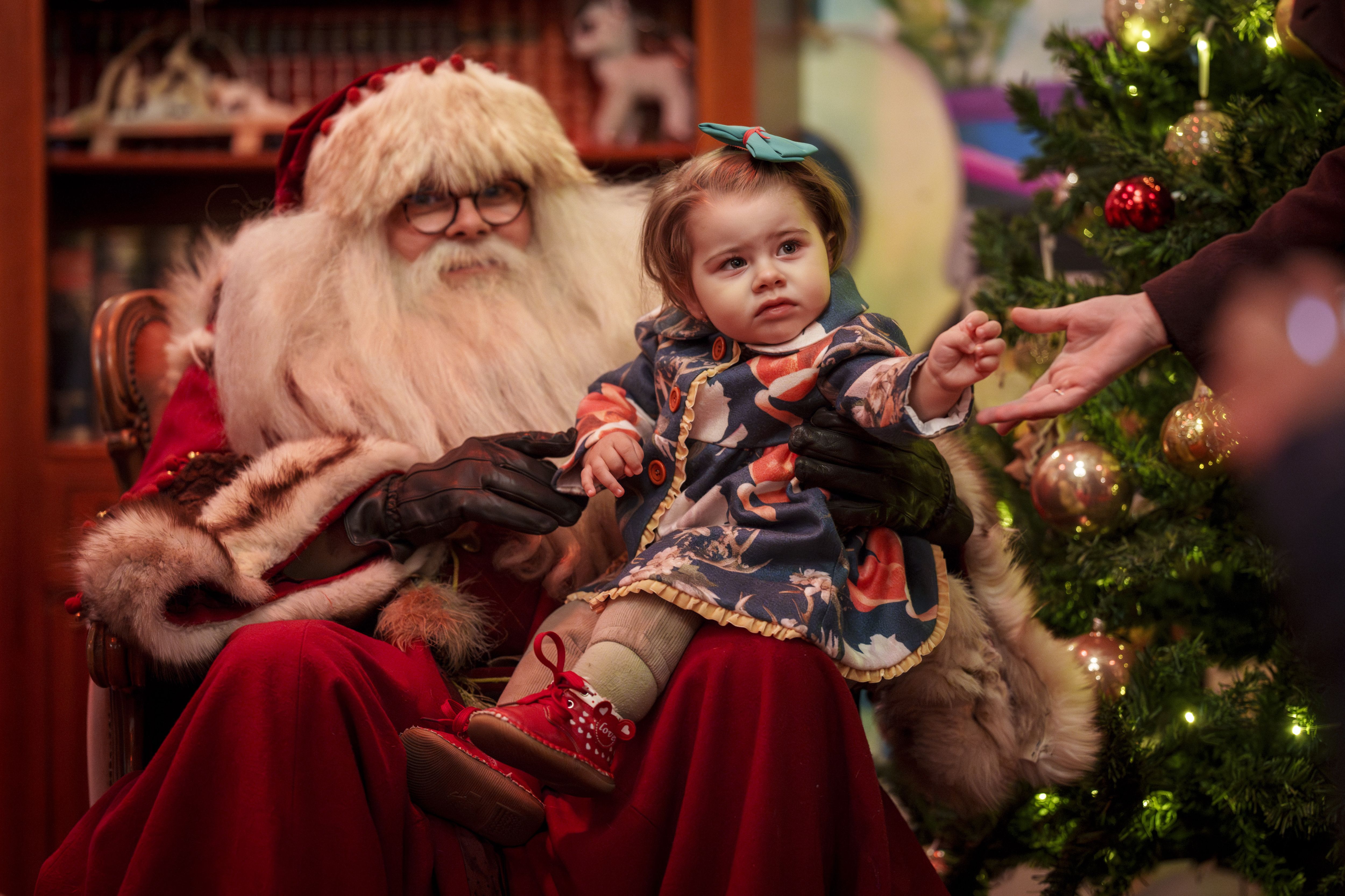 Diana, 22 months old, reaches for her mother's hand as she poses with a man wearing a Santa Claus outfit at Christmas fair in Bucharest, Romania, Saturday, December 14, 2024. (Photo by Vadim Ghirda/AP Photo)