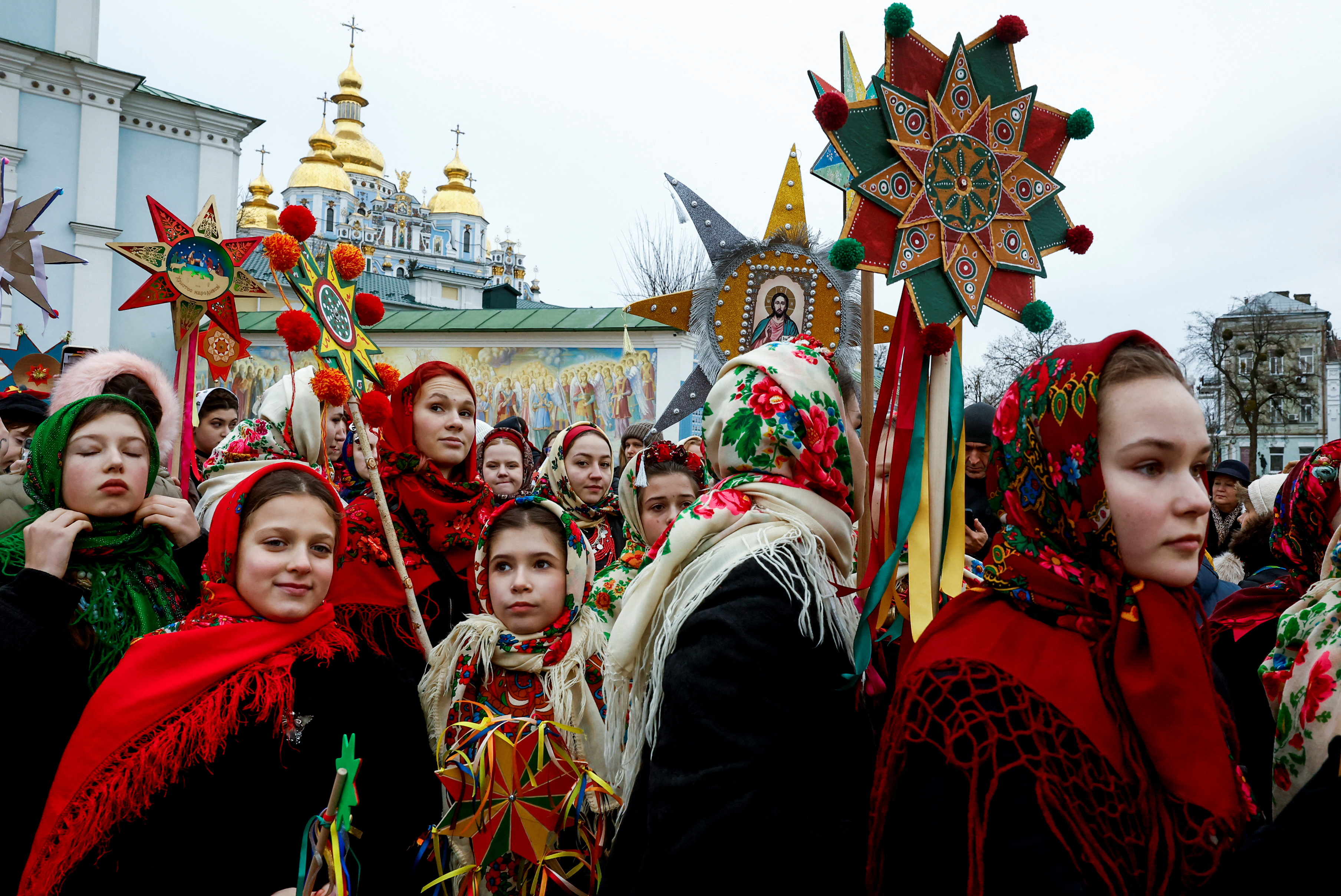 People wear traditional Ukrainian clothes as they mark Christmas Day with a carol singing event outside St. Michael's Golden-Domed Monastery, amid Russia's attack on Ukraine, in Kyiv, Ukraine, on December 25, 2024. (Photo by Thomas Peter/Reuters)