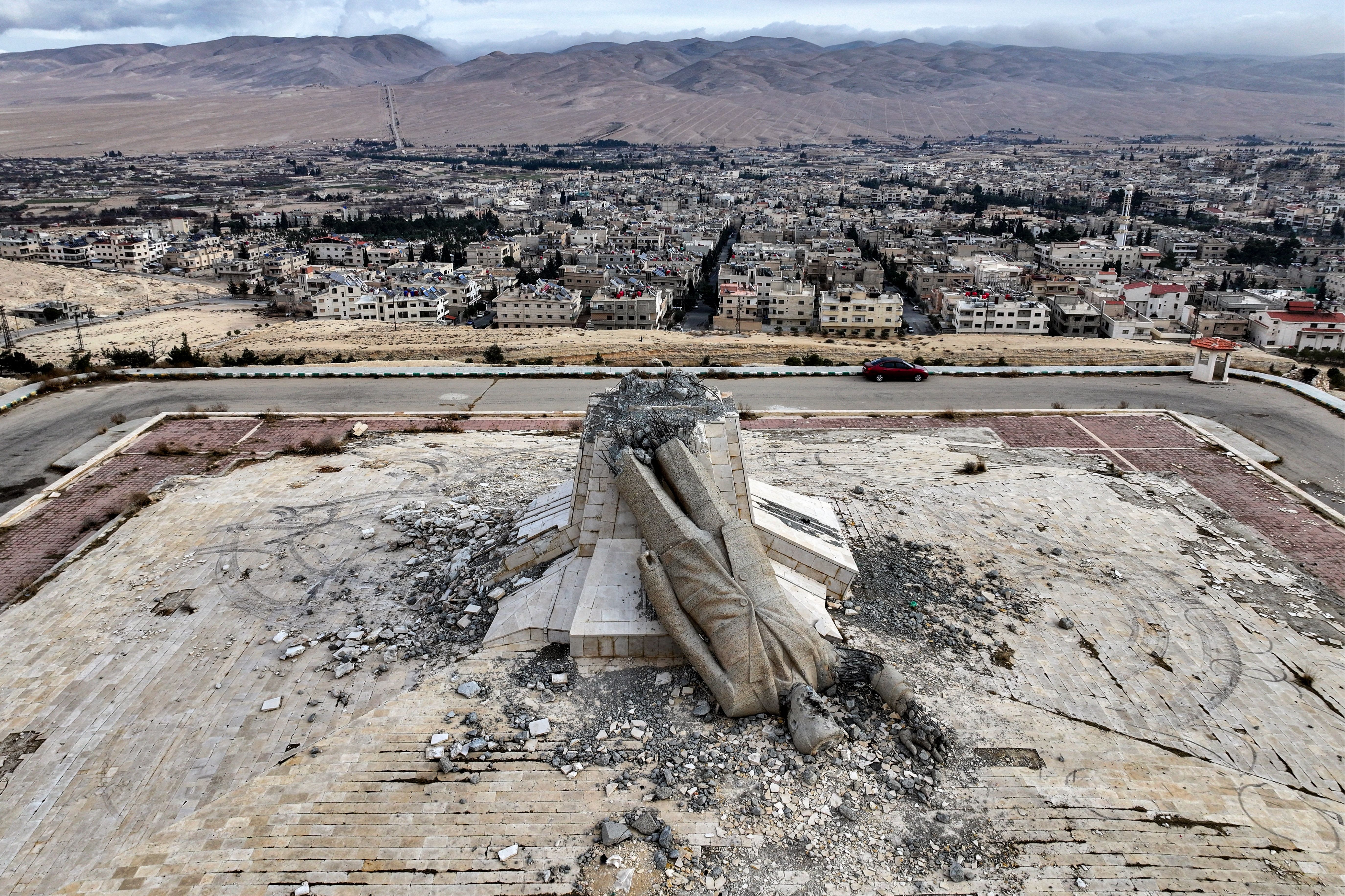 This aerial view shows the remains of a destroyed monument to Syria's late president Hafez al-Assad, father of ousted president Bashar al-Assad who died in 2000, in Deir Attiyah in the countryside of Damascus on December 28, 2024. The monument in Deir Attiyah was the largest statue of Hafez al-Assad until it was destroyed on December 8 after Bashar al-Assad fled the countrty and Islamist rebels took the capital Damascus. (Photo by Omar Haj Kadour/AFP Photo)
