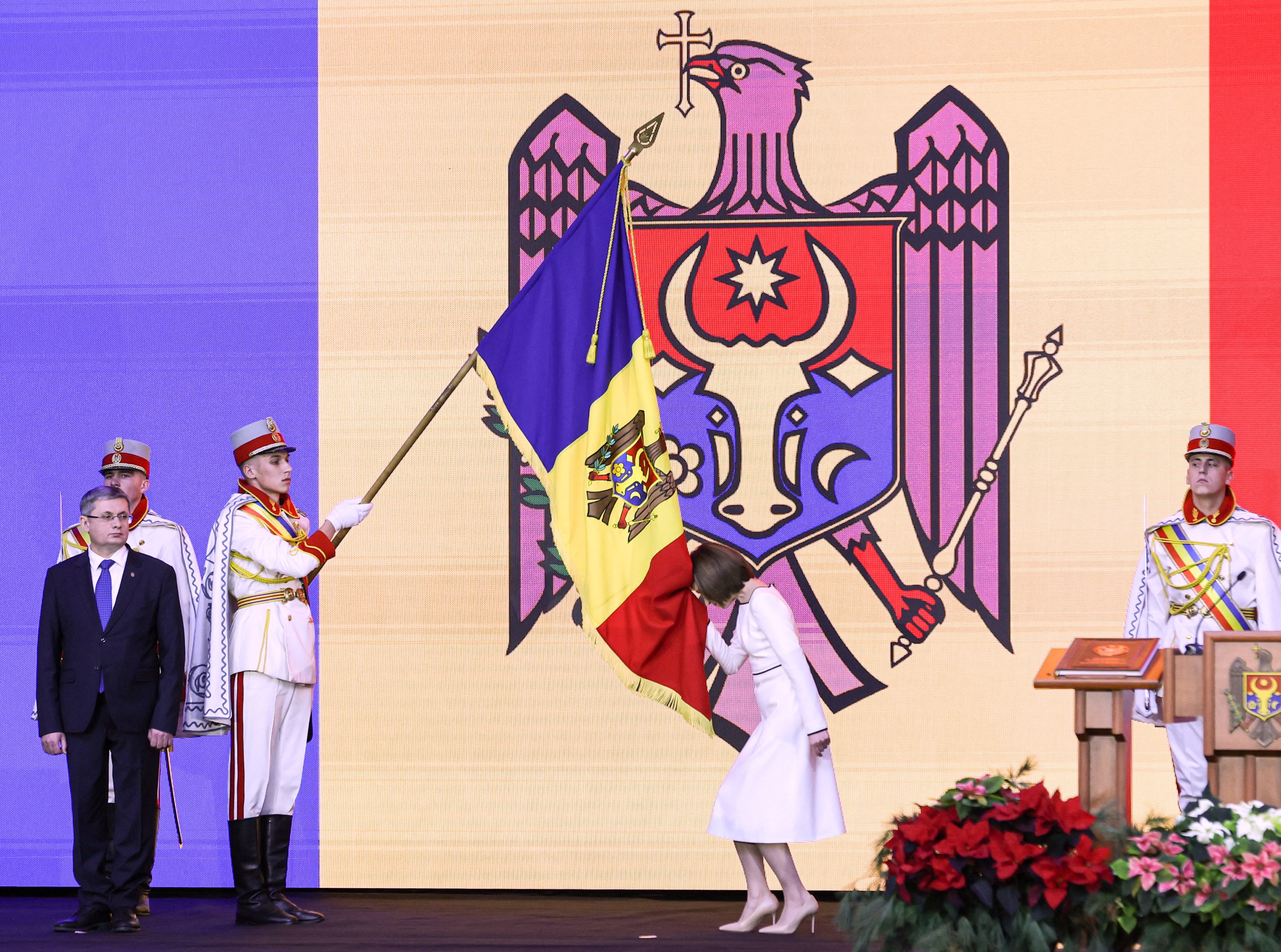 Moldovan President Maia Sandu (C) takes part in her swearing-in ceremony in Chisinau December 24, 2024. Moldova's pro-European President Maia Sandu was re-elected on November 3, 2024, after a tense vote that has laid bare divisions in the former Soviet republic bordering war-torn Ukraine. (Photo by Elena Covalenco/AFP Photo)