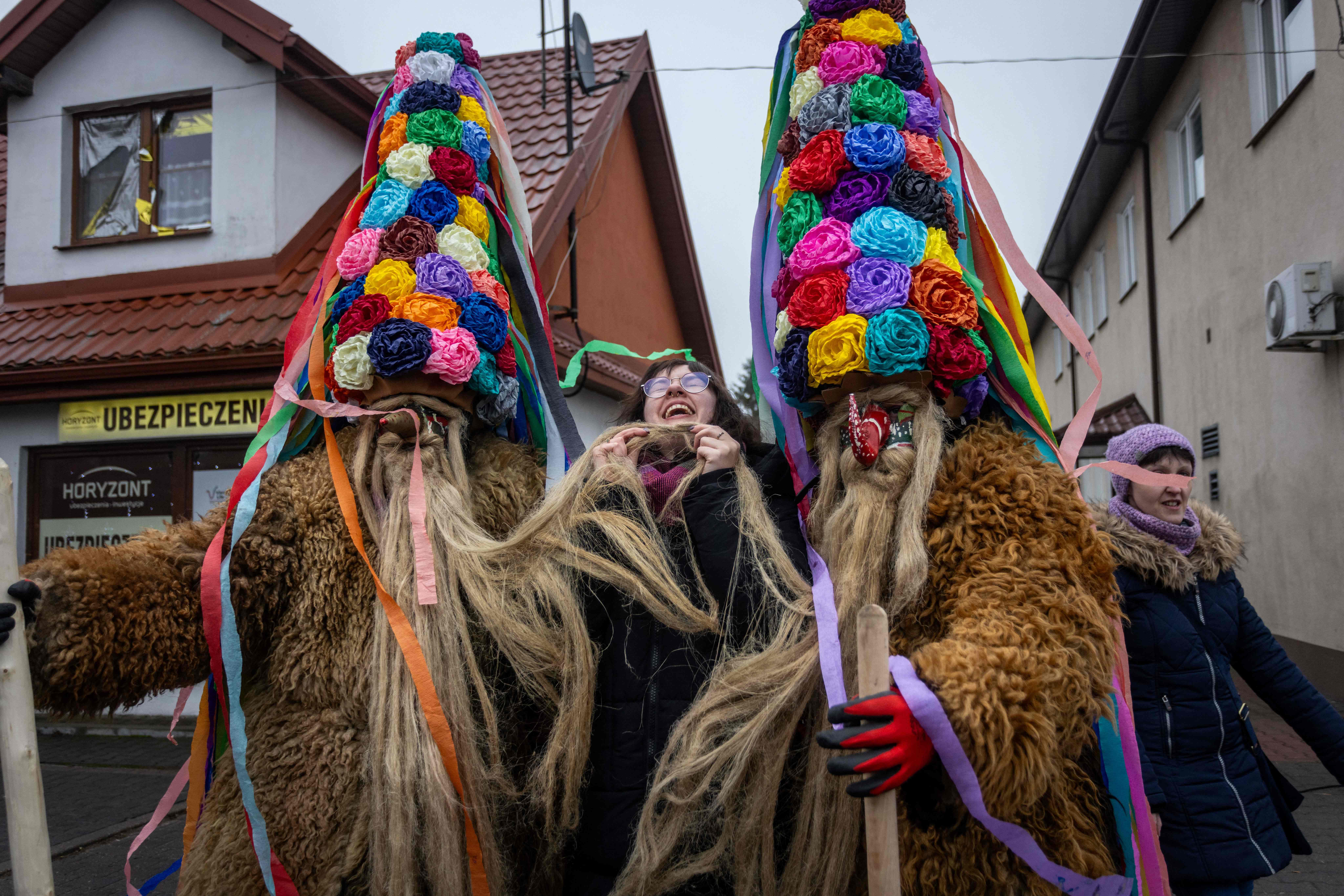 Two men dressed as Brodacze (Bearded men) pose for the picture with a young woman in Slawatycze, Podlasie region in eastern Poland on December 29, 2024. Brodacze (Bearded men) are a local new year tradition in Slawatycze in the Podlasie region and specific to this one town in Poland. On the last three days of the year, local young men dressed as bearded figures, wearing special masks and colorful costumes parade through the streets of Slawatycze and hassle passers-by to bid farewell to the old year and welcome the new one. (Photo by Wojtek Radwanski/AFP Photo)