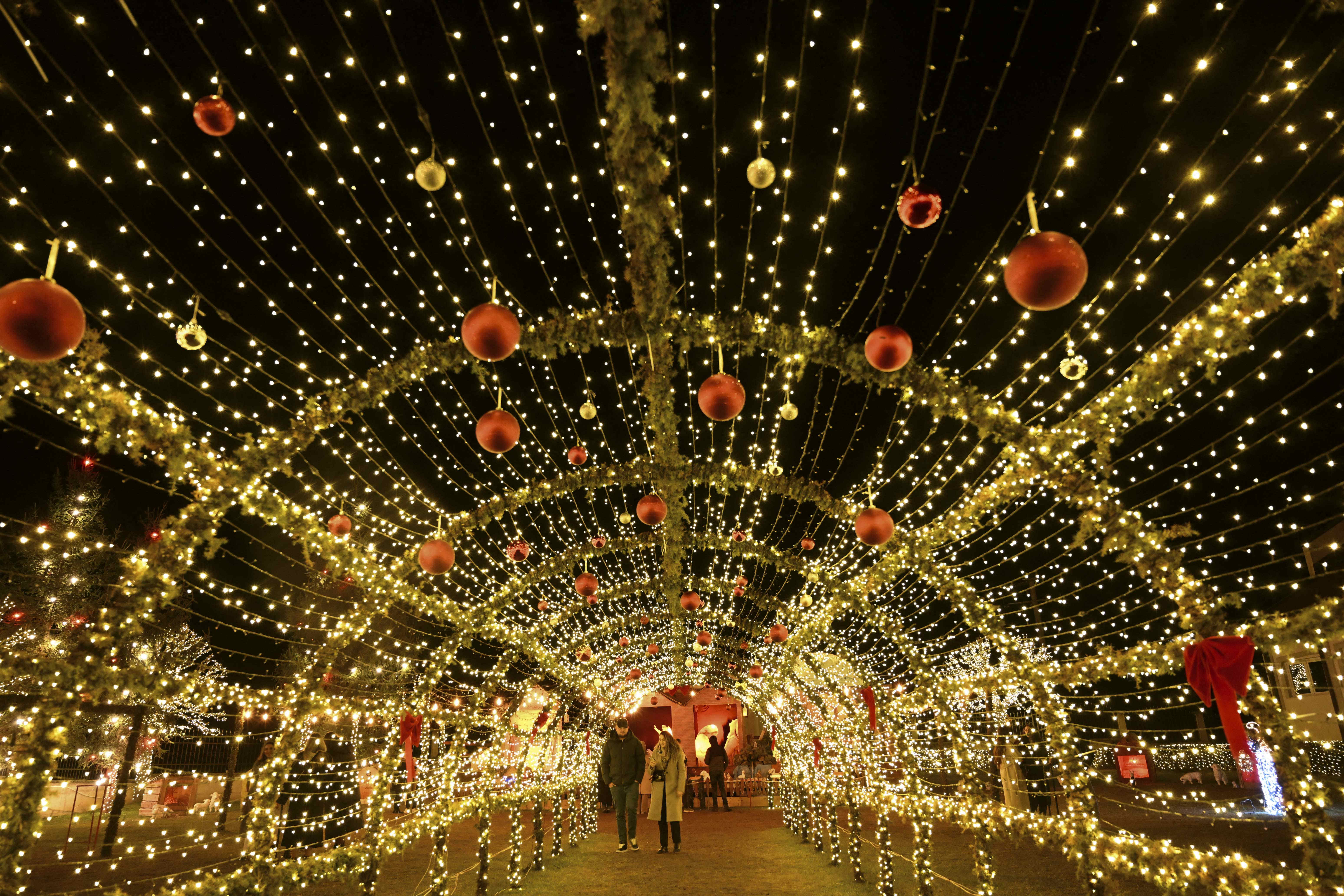 Visitors walk under Christmas decorations at the local Catholic church on the eve of the Christmas celebrations in the village of Petrushan, near the town of Gjakova, Kosovo on December 22, 2023. (Photo by Armend Nimani/AFP Photo)