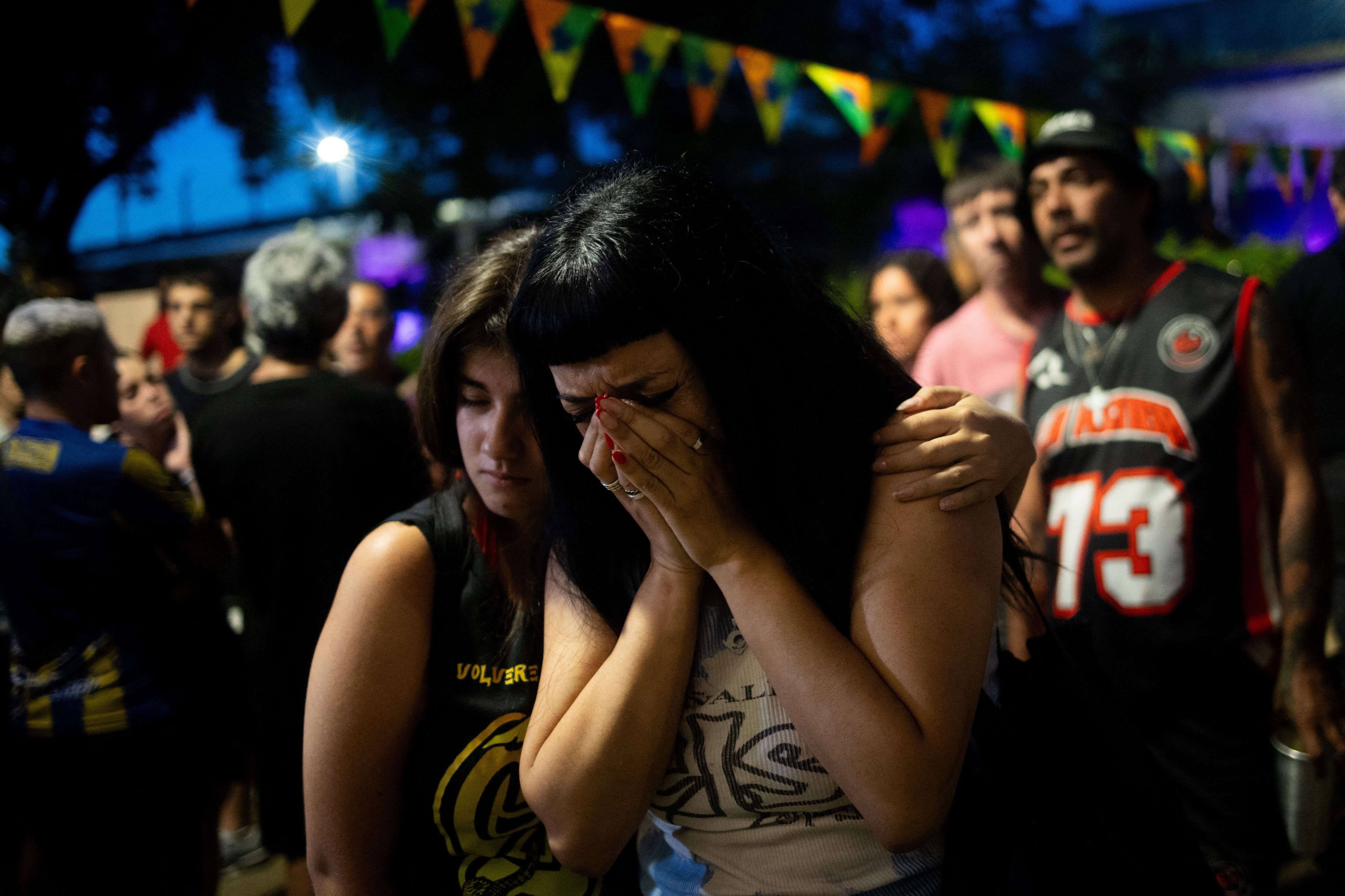A woman mourns during the 20th anniversary of the Republica Cromanon disco fire, in which 194 young people were killed and hundreds more injured in Buenos Aires on December 30, 2024. The names of the victims are still painted on the exterior walls of the wrecked nightclub. (Photo by Tomás Cuesta/AFP Photo)