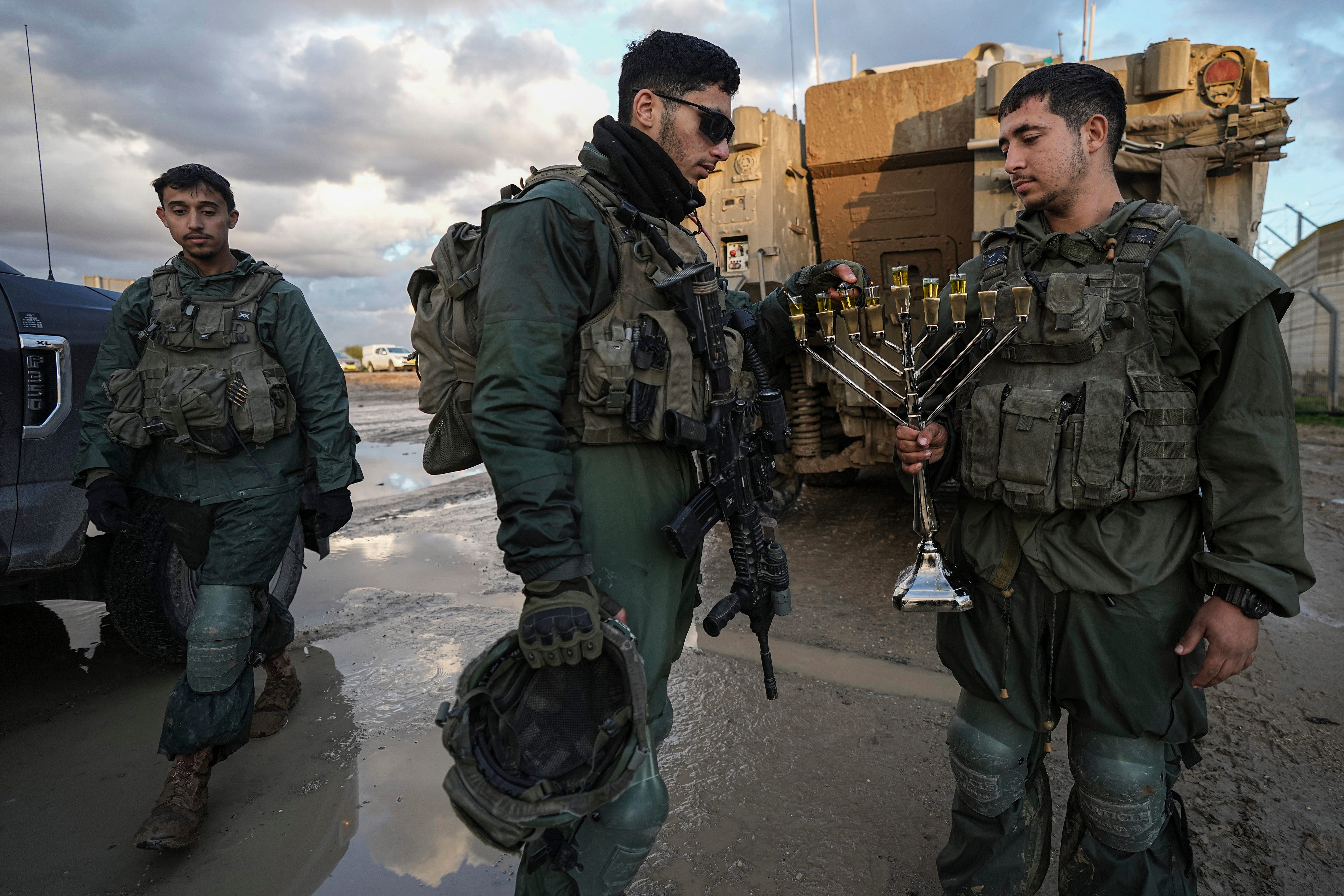 Israeli soldiers light a candle on the seventh night of Hanukkah before being deployed to the Gaza Strip near the Israeli-Gaza border in southern Israel, Tuesday, December 31, 2024. (Photo by Tsafrir Abayov/AP Photo)