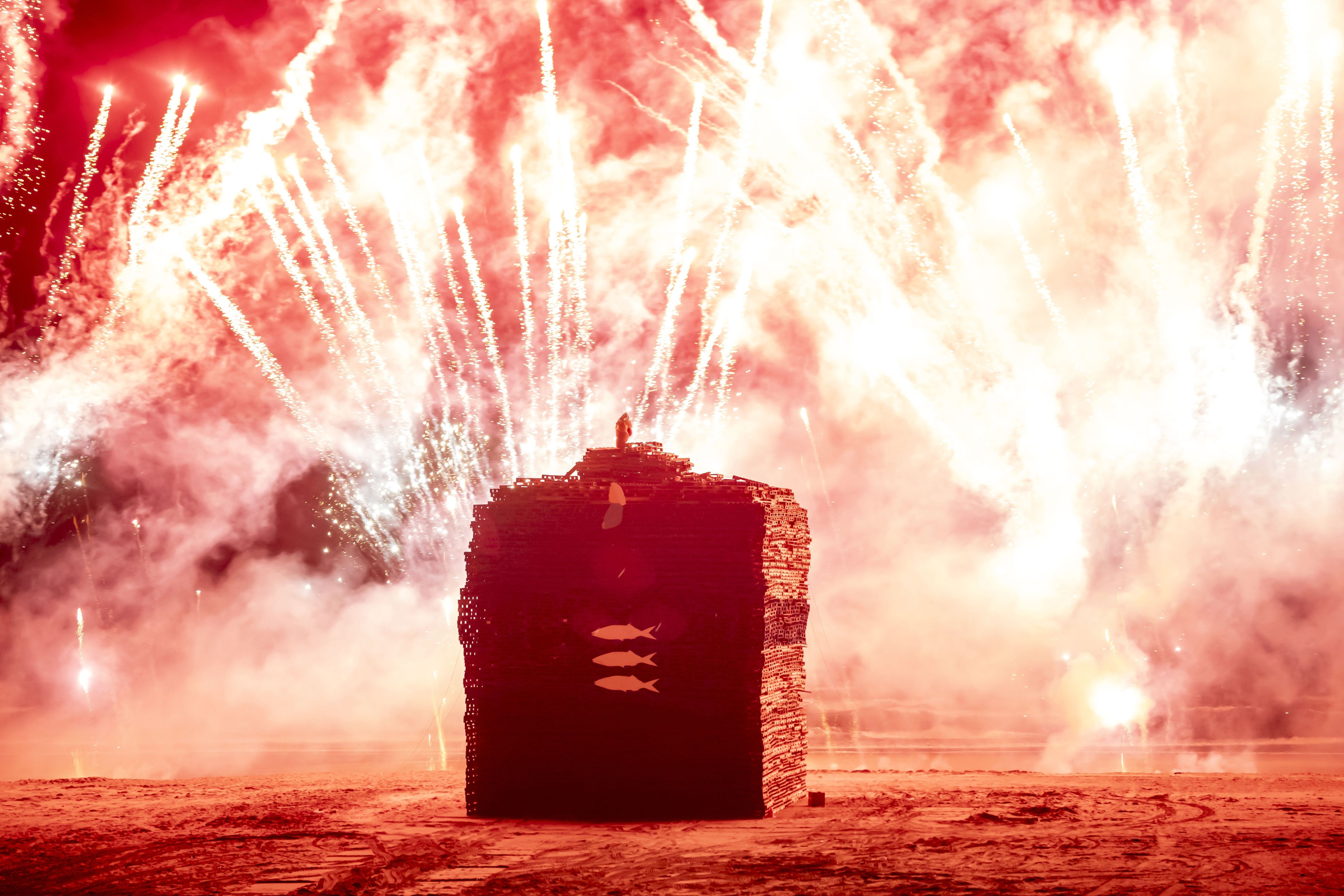 Fireworks precede the annual bonfire on Scheveningen North Beach, near the Hague in the Netherlands on December 30, 2024, which was lit a day early this year because of forecast bad weather. (Photo by Hollandse Hoogte/Rex Features/Shutterstock)