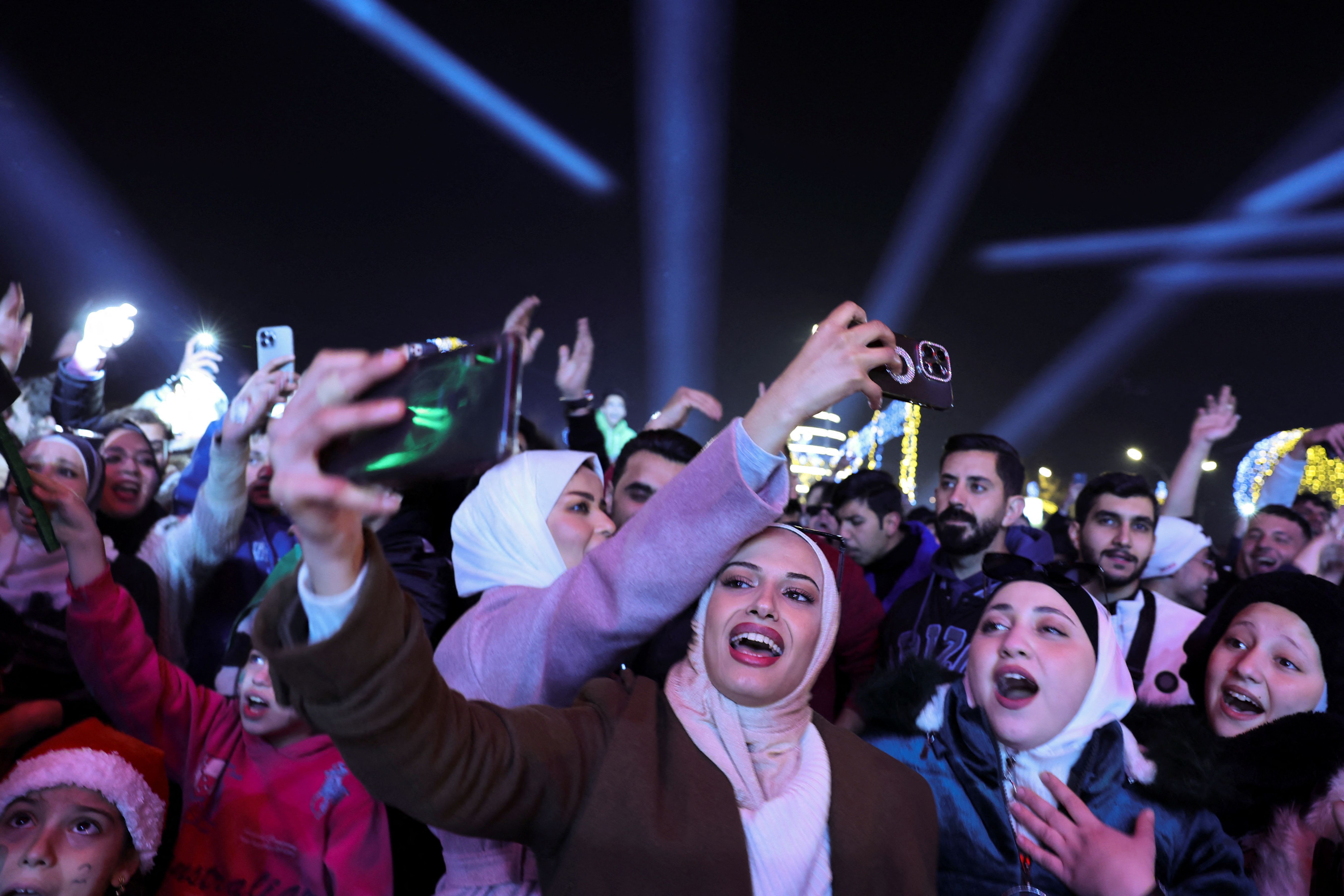 A woman uses a mobile phone as people gather during New Year's celebrations, after the ousting of Syria's Bashar al-Assad, in Damascus, Syria, on January 1, 2024. (Photo by Amr Abdallah Dalsh/Reuters)