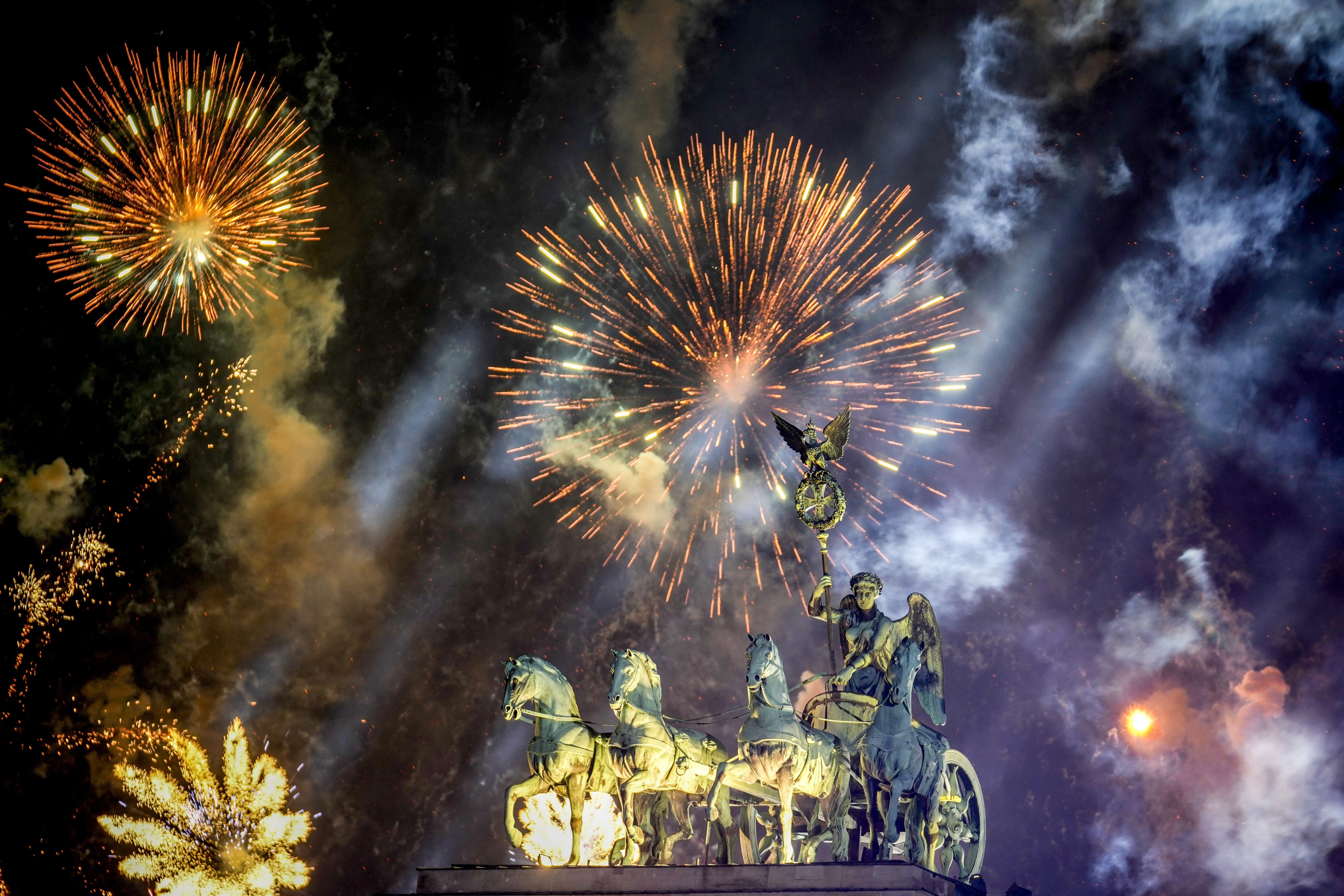 Fireworks light the sky above the Quadriga at the Brandenburg Gate during New Year's celebrations shortly after midnight in Berlin, Germany, Wednesday, January 1, 2025. (Photo by Ebrahim Noroozi/AP Photo)