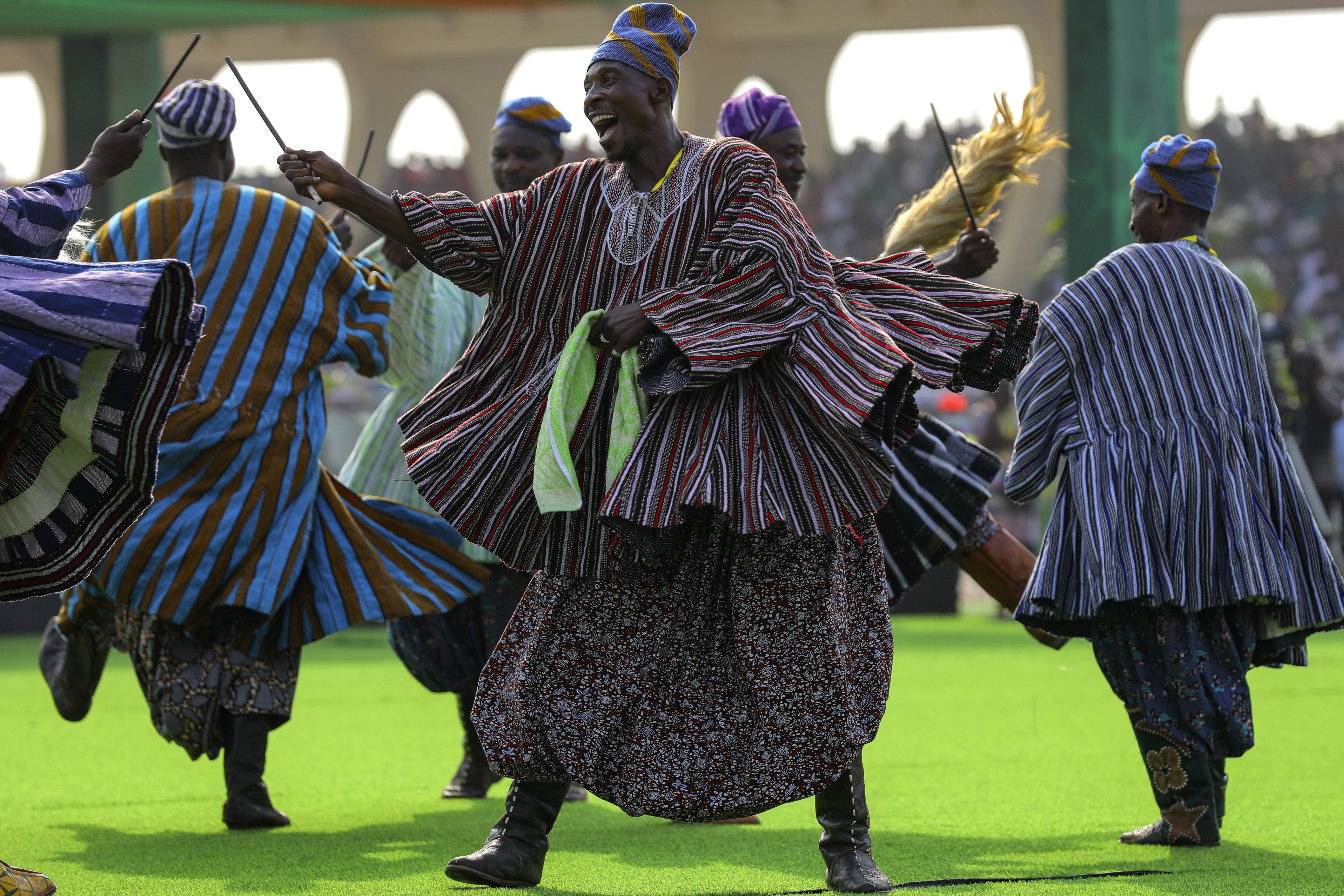 Traditional dancers perform during the inauguration ceremony of Ghana's President John Dramani Mahama at Independence Square in Accra, Ghana, Tuesday, January 7, 2025. (Photo by Misper Apawu/AP Photo)