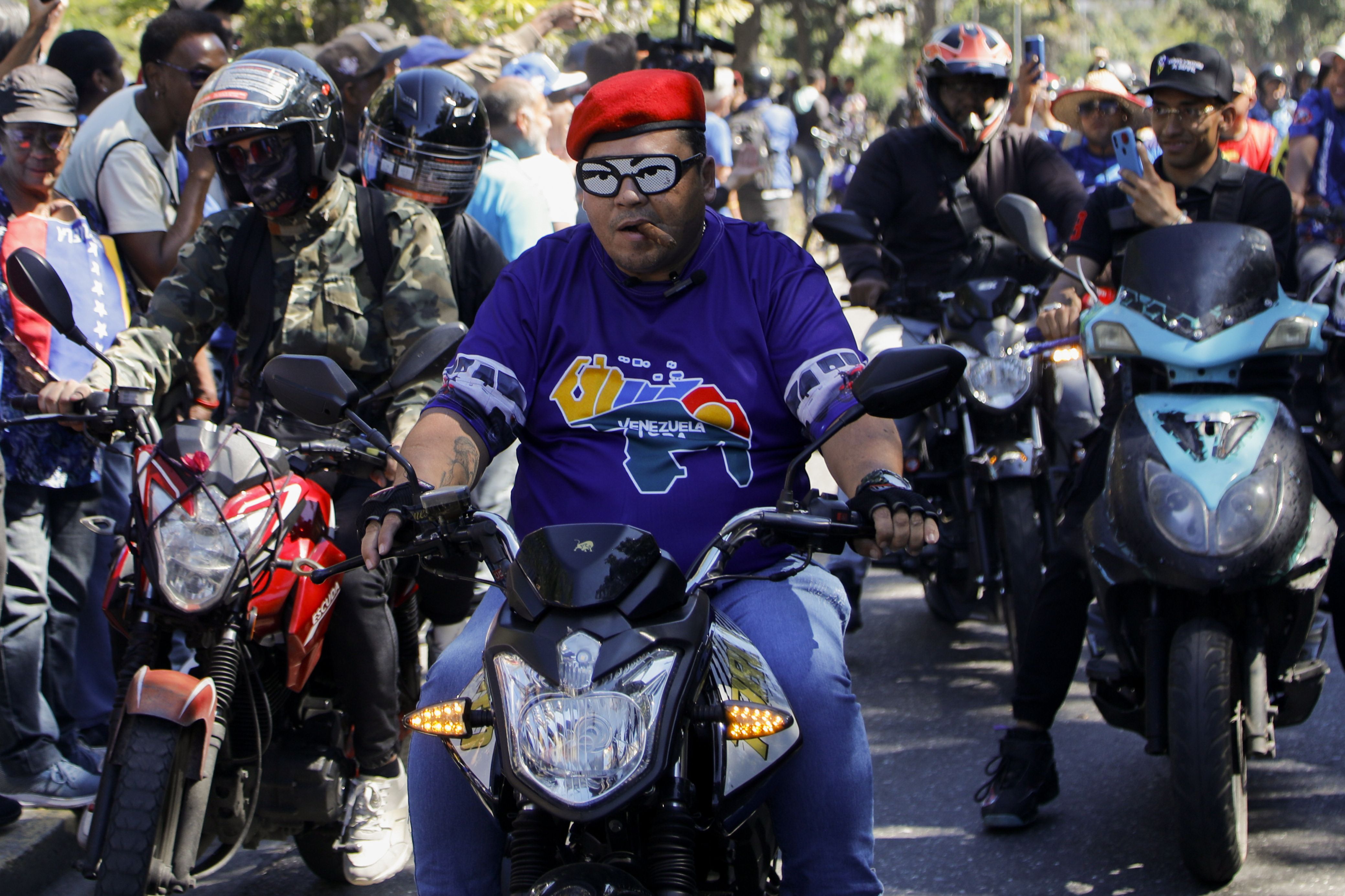 Government supporters ride past opponents of Venezuelan President Nicolas Maduro protesting a day before he will be sworn-in for a third six-year term despite credible evidence that he lost the presidential election, in Caracas, Venezuela, January 9, 2025. (Photo by Cristian Hernandez/AP Photo)
