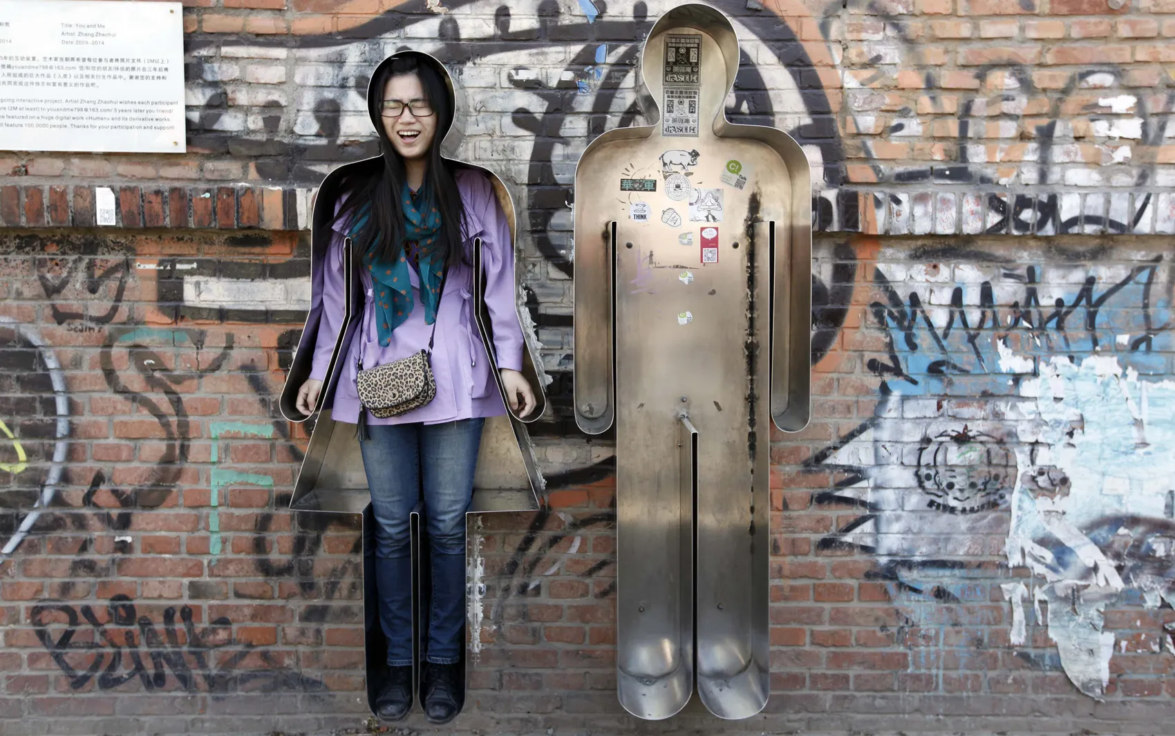 A visitor reacts as she poses for a photograph in an art installation entitled “You and Me” in Beijing's 798 art area April 18, 2013. (Photo by Jason Lee/Reuters)