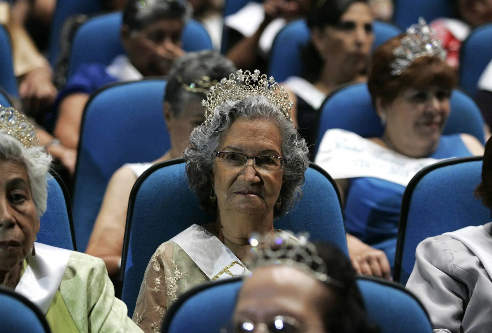 Elderly women wearing tiaras sit in the audience during a beauty pageant for elderly women called the “Queen of the Elderly” in Guadalajara, Mexico, on April 17, 2013. Eight contestants, ranging in age from 65-75, answered questions about their lives and what it means to be a senior citizen in today's society, as they competed in the annual event to win the top prize of a handbag and jewellery creations by local designers. (Photo by Alejandro Acosta/Reuters)