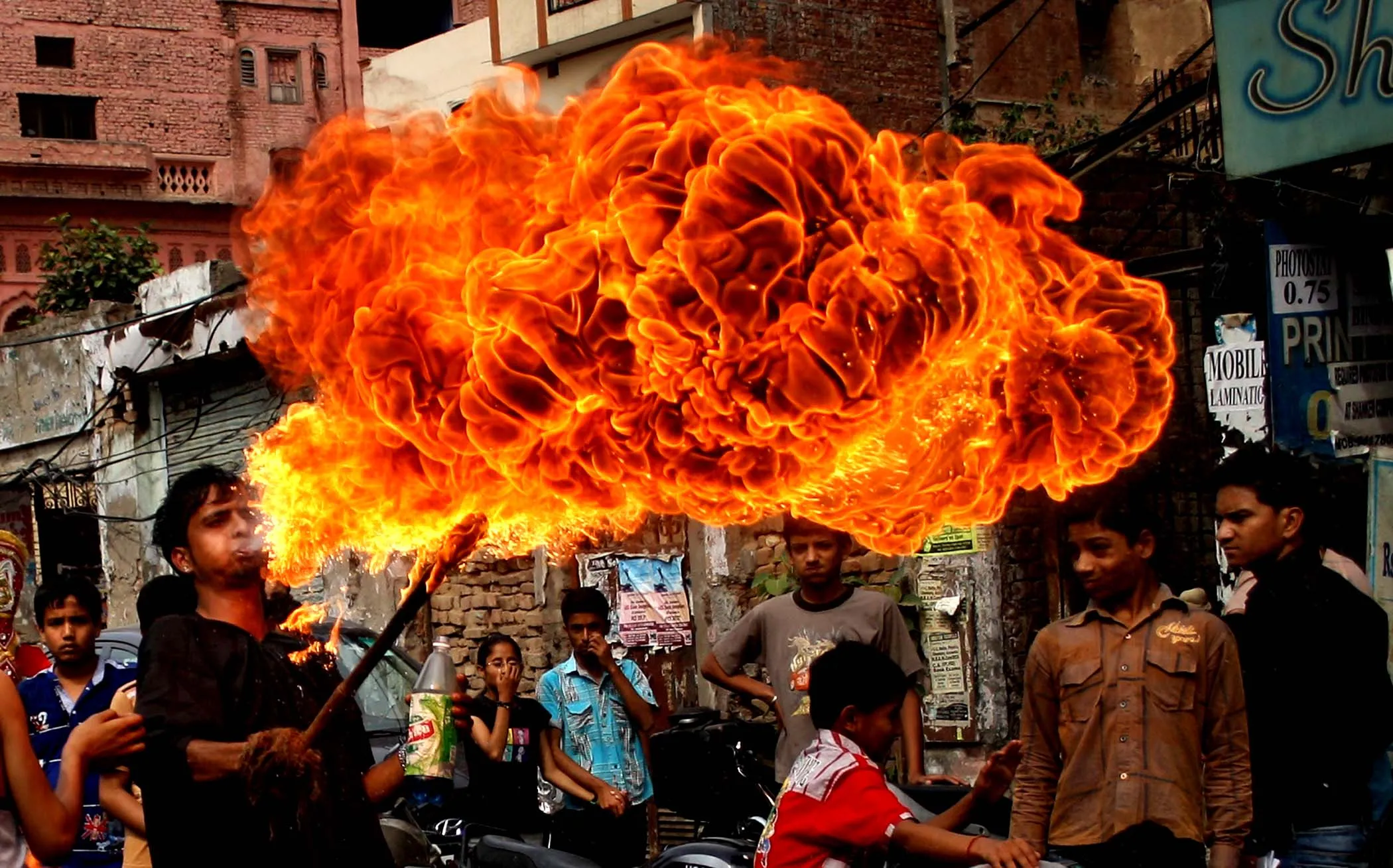 A boy blows fire during a religious procession in Amritsar, India, to celebrate the birthday of the Hindu god Rama, on April 19, 2013. (Photo by Sanjeev Syal/Associated Press)