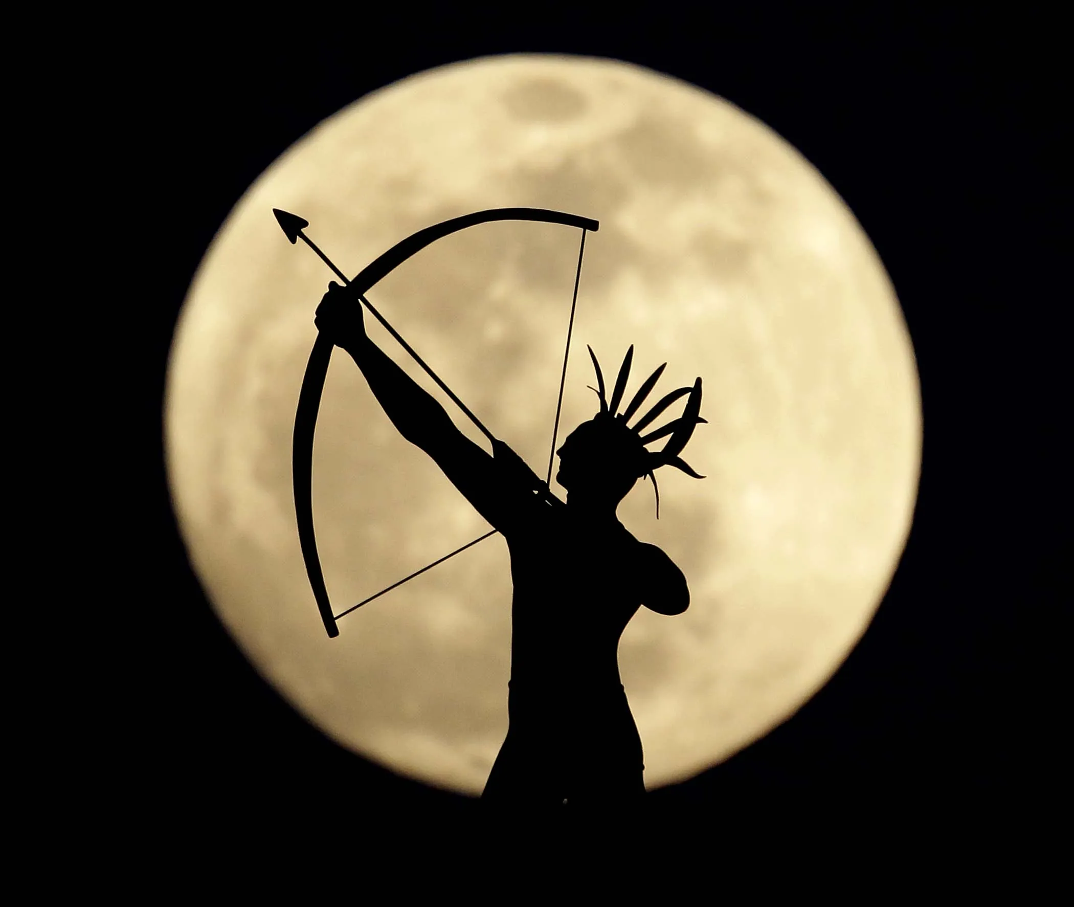 A full moon rises behind a statue of a Kansas Indian on top of the Kansas Statehouse in Topeka, on April 24, 2013. (Photo by Charlie Riedel/Associated Press)