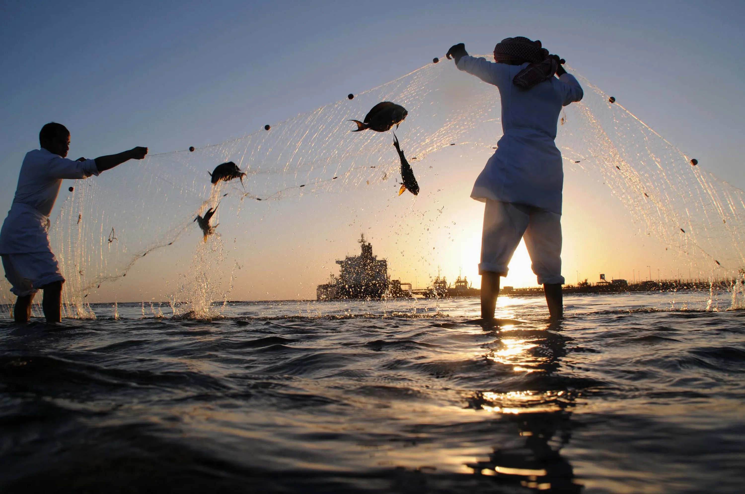 Fishermen check their nets for the day's catch as an oil tanker is seen in the distance near the port in the north-western city of Duba April 20, 2013. (Photo by Mohamed Al Hwaity/Reuters)