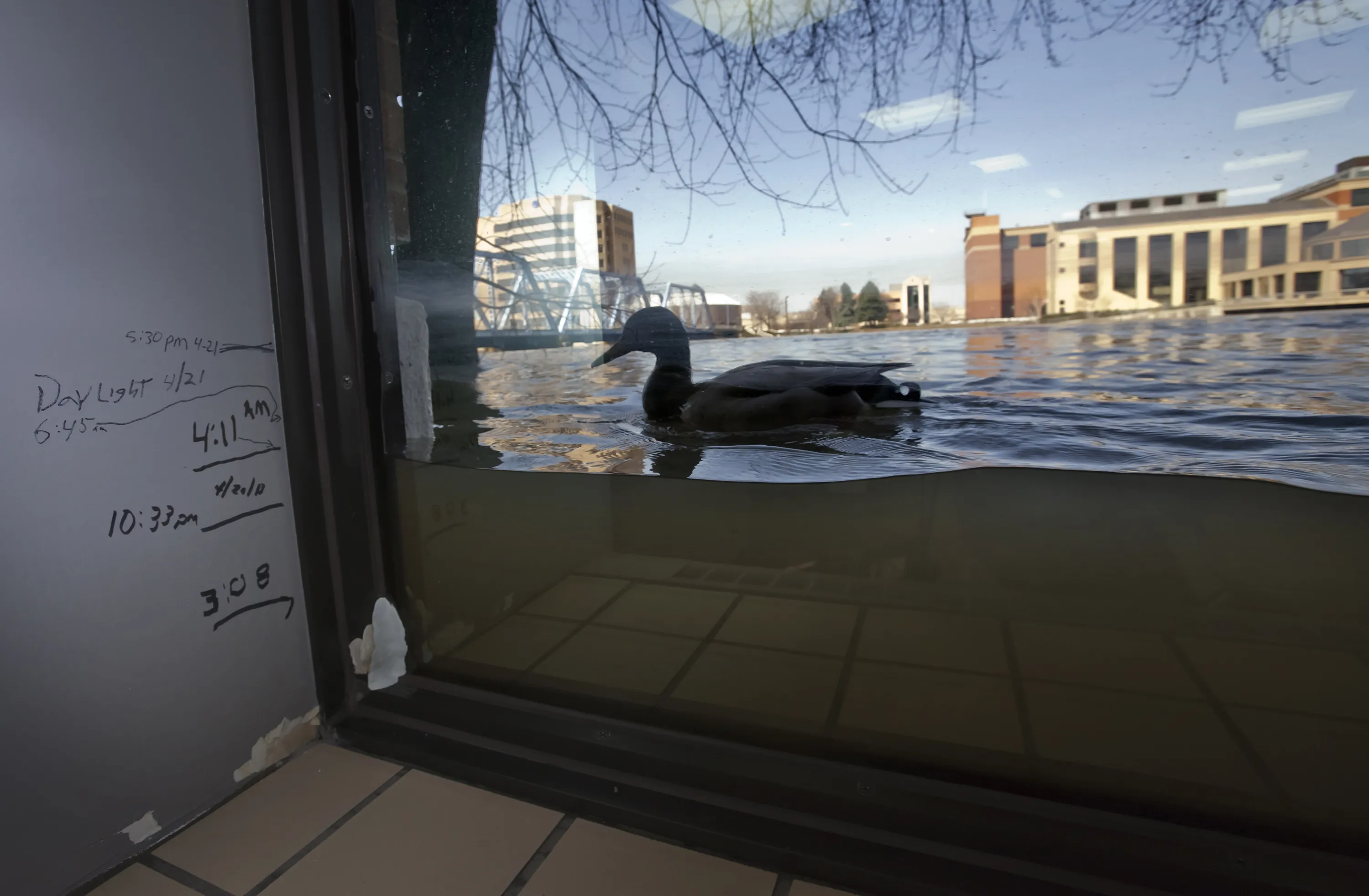 A duck swims a window, viewed from inside Anderson Eye Care at the Riverfront Plaza Building in downtown Grand Rapids, Mich., as The Grand River crests on Monday, April 22, 2013, at an all time high of 21.85 feet, a full 2.2 feet above the record set in 1985, in downtown Grand Rapids. Previous water levels can be seen marked on the wall. (Photo by Cory Morse/AP Photo/The Grand Rapids Press)
