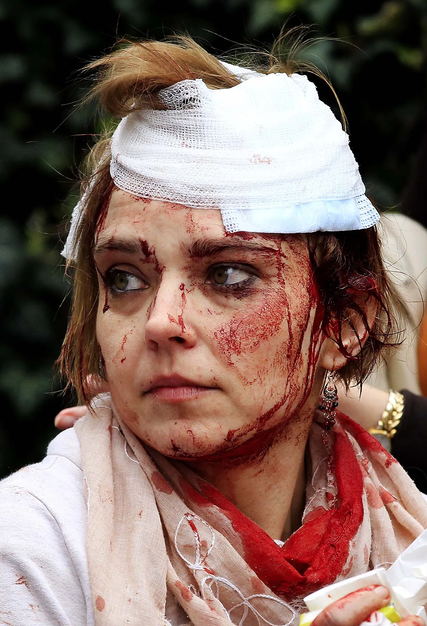 An injured woman gets treatment after an explosion in Prague, on April 29, 2013. Police said a powerful explosion has damaged a building in the center of the Czech capital and they believe some people are buried in the rubble. (Photo by Petr David Josek/Associated Press)