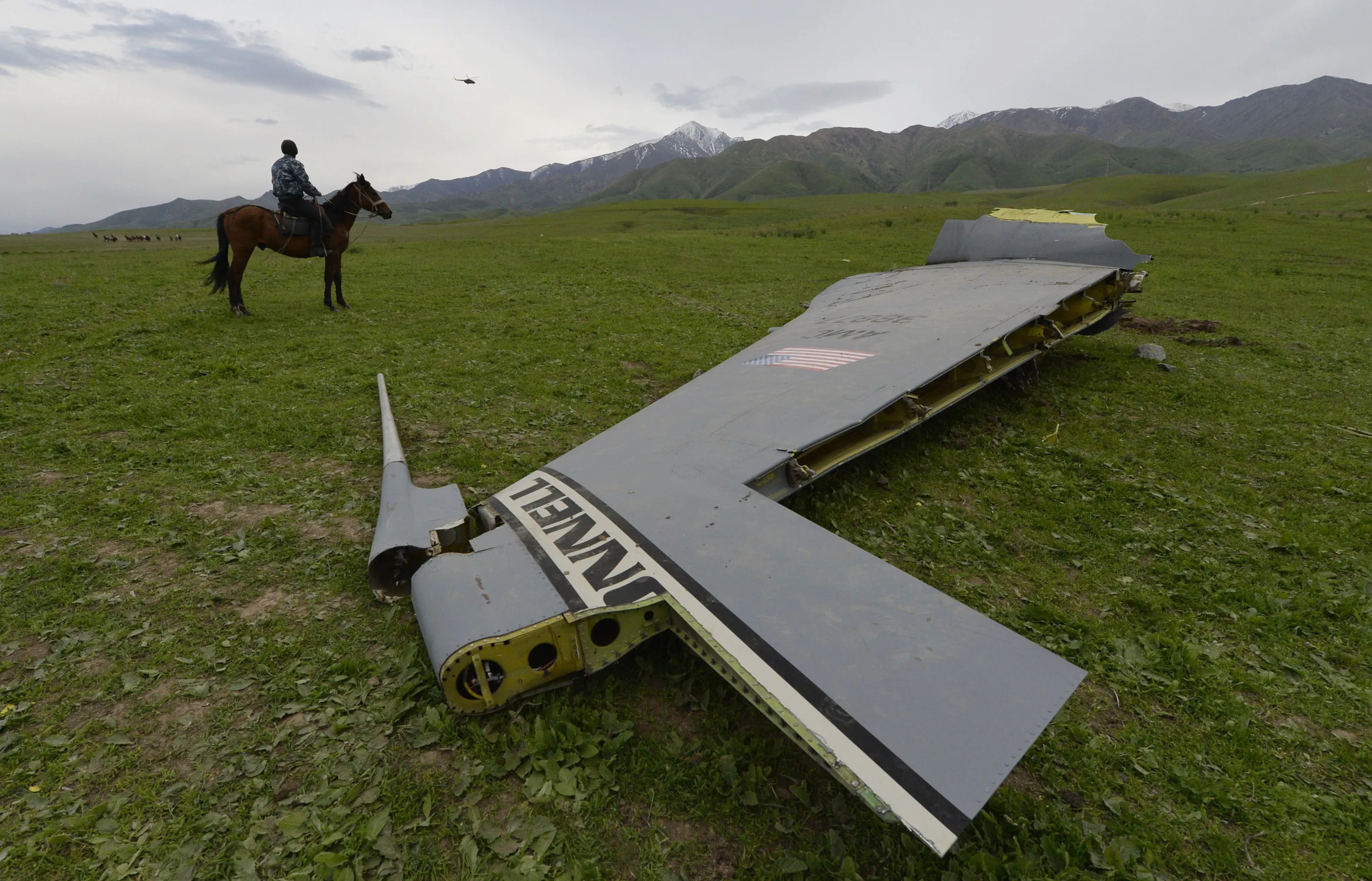 A U.S. Air Force KC-135 tanker aircraft wreckage is strewn across a field near the village of Chaldovar, about 100 miles (160 kms) west of the Kyrgyz capital Bishkek, Friday May 3, 2013. The emergencies ministry in Kyrgyzstan says a US military plane has crashed in the country. Kyrgyzstan hosts a US base that is used for troops transiting into and out of Afghanistan and for C-135 tanker planes that refuel warplanes in flight. (Photo by Vladimir Voronin/AP Photo)