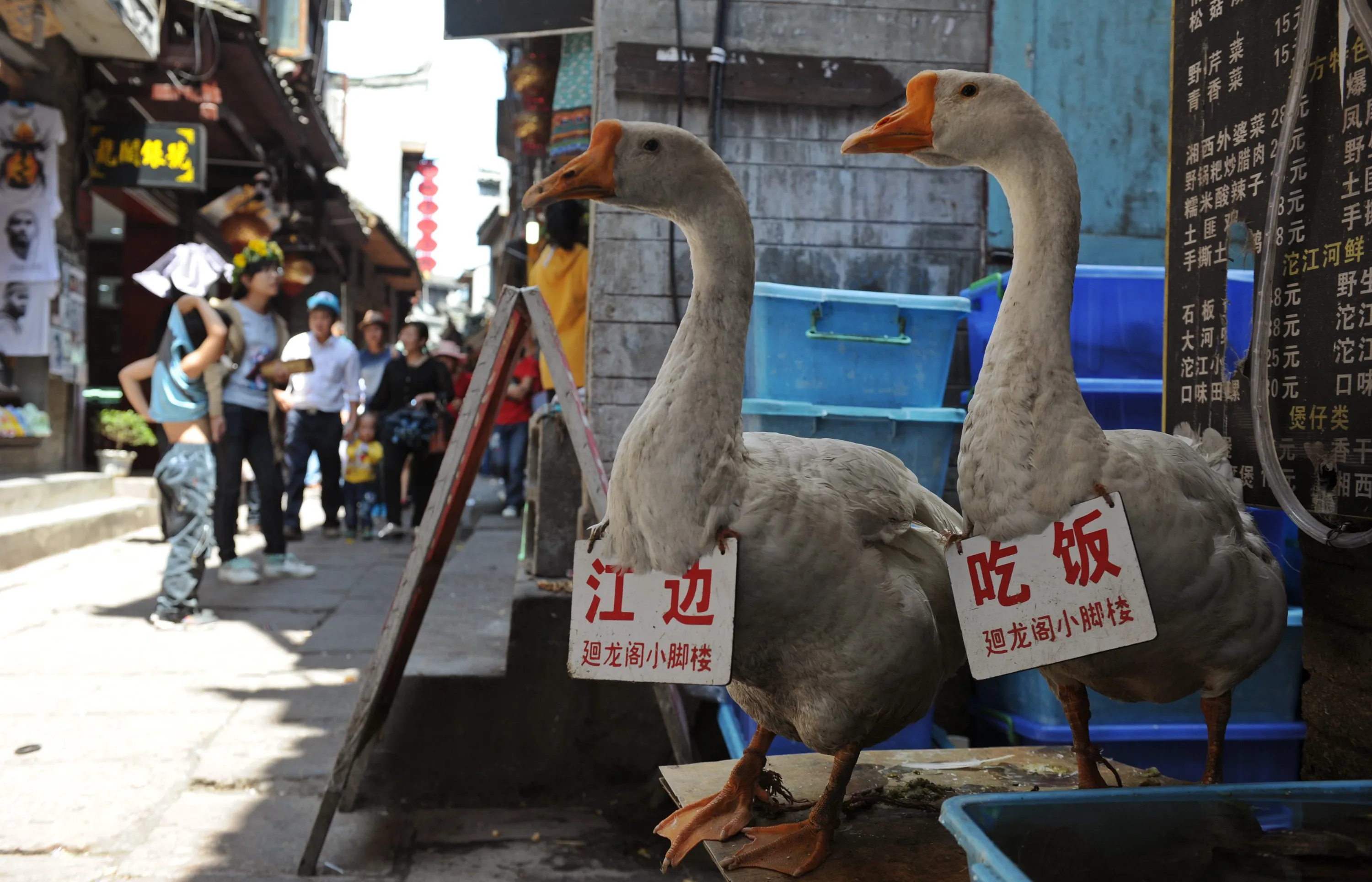 Geese carrying advertisement boards stand in front of a restaurant as a way to attract tourists in Fenghuang county, Hunan province, May 1, 2013. The bigger Chinese characters on the boards read, “Riverside” (L) and “Dining”. (Photo by Reuters/Stringer)