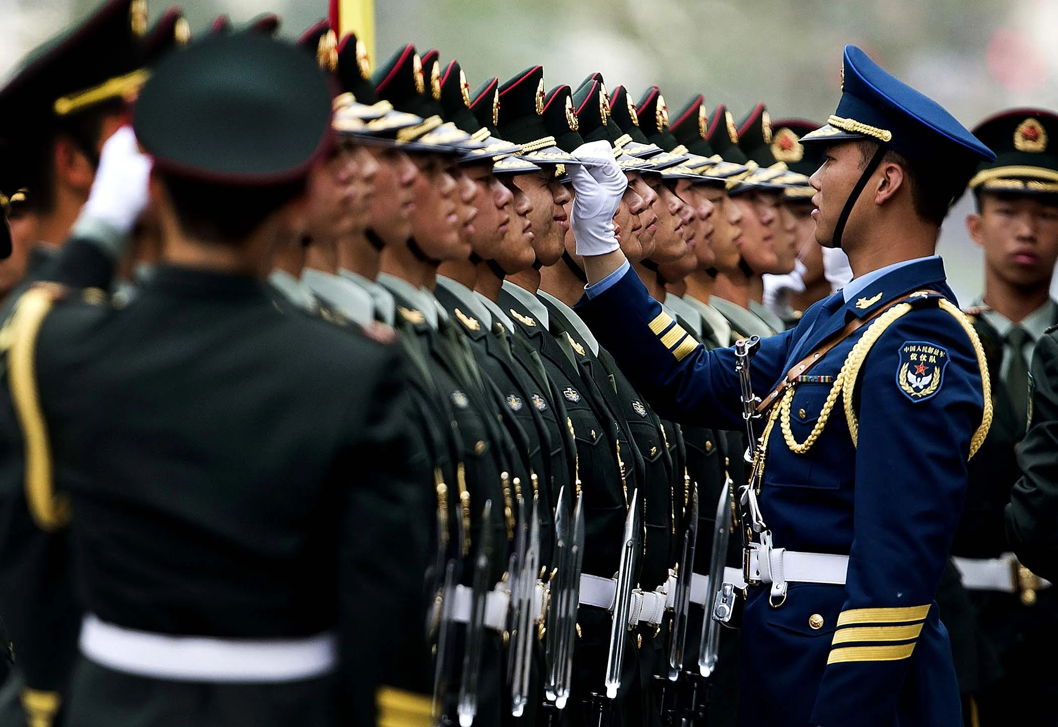 Chinese military officers use a piece of rope to line up honor guards as they prepare for a welcome ceremony for Greece's Prime Minister Antonis Samaras at the Great Hall of the People in Beijing, on May 16, 2013. (Photo by Andy Wong/Associated Press)