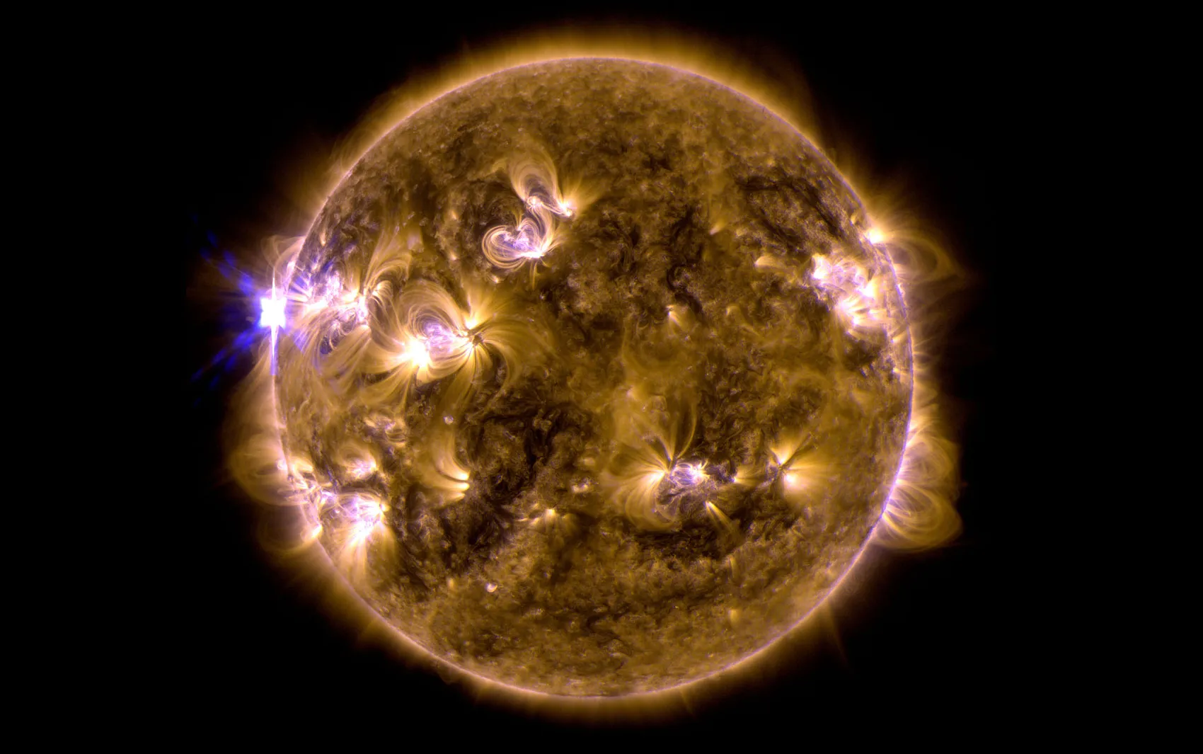 This blend of two images taken by NASA’s Solar Dynamics Observatory shows a solar eruption that occurred on May 12, 2013. One image shows light in the 171-angstrom wavelength, the other in 131 angstroms. Scientists say the Mother’s Day solar flare was the strongest of the year and occurred on the side of the sun that faced away from Earth. (Photo by AP Photo/NASA's Solar Dynamics Observatory)
