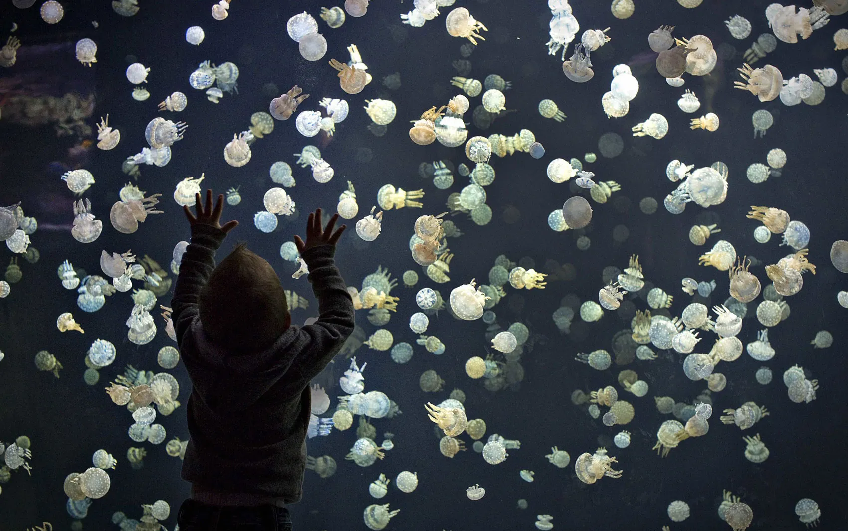A child watches jellyfish swim in a large tank at the Vancouver Aquarium in Vancouver, British Columbia May 16, 2013. The tank contains around 2,000 spotted jellyfish and is part of a major display of 15 various species from around the world. (Photo by Andy Clark/Reuters)