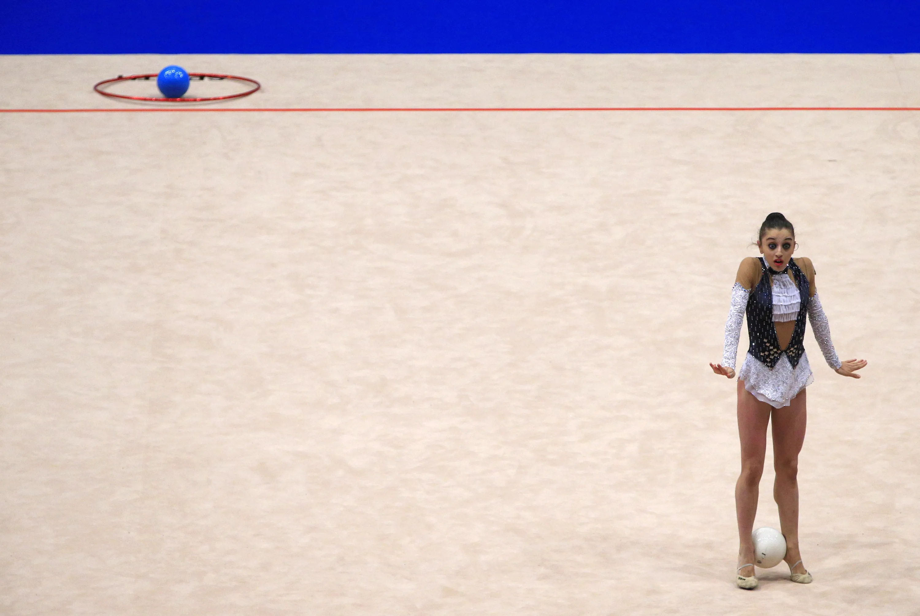 Azerbaijan's Lala Yusifova performs with the ball during the senior individual team competition as part of the 29th rythmic gymnastics European Championships held at the Stadthalle in Vienna, on May 31, 2013. (Photo by Alexander Klein/AFP Photo)