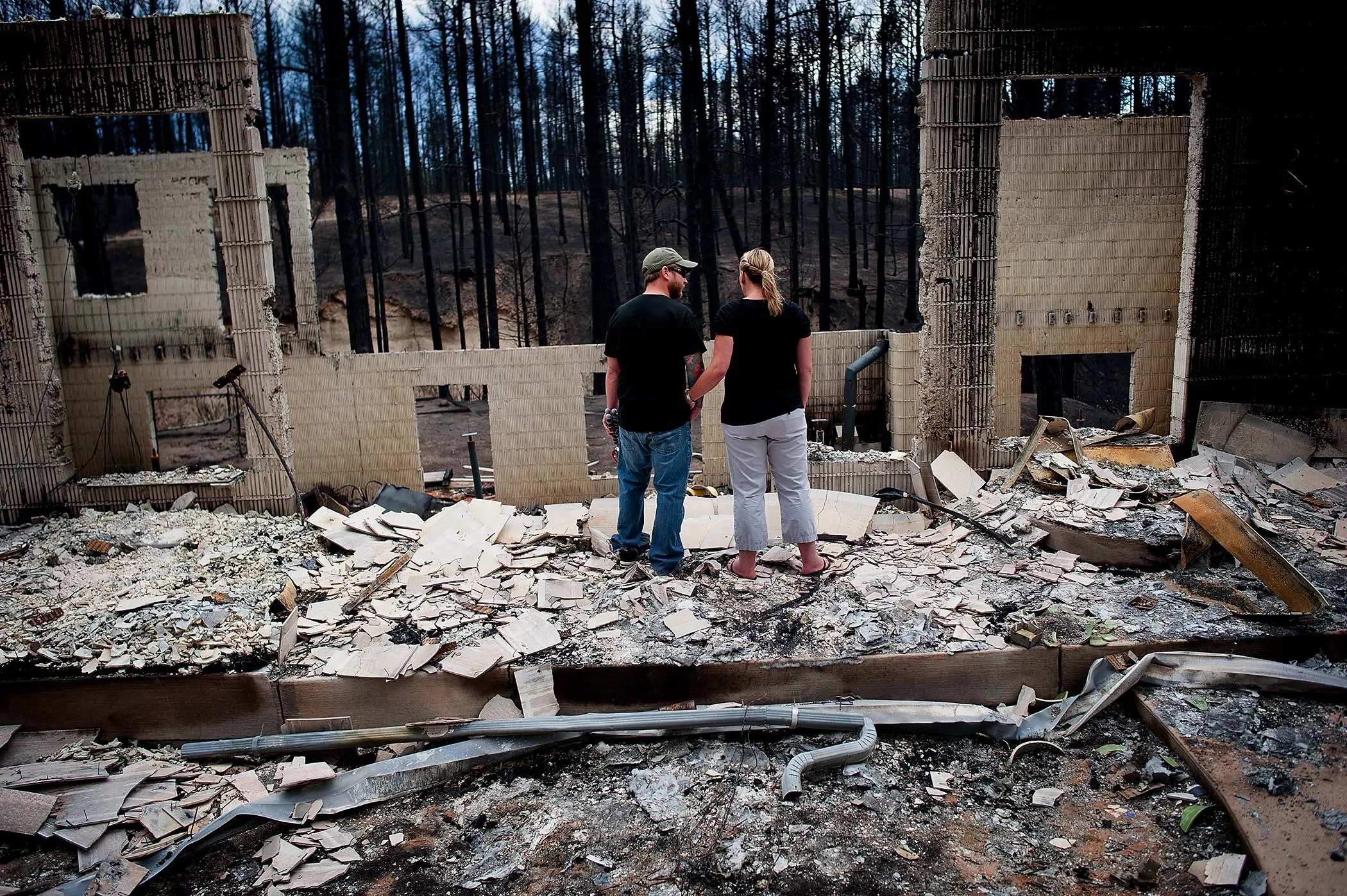 Jeremy and Kelly Beach look into the remains of their home off Ravine Drive in Colorado Springs, on June 18, 2013. As the West battles one catastrophic wildfire after another, the federal government is spending less and less on its main program for preventing blazes in the first place. (Photo by Michael Ciaglo/The Colorado Springs Gazette)