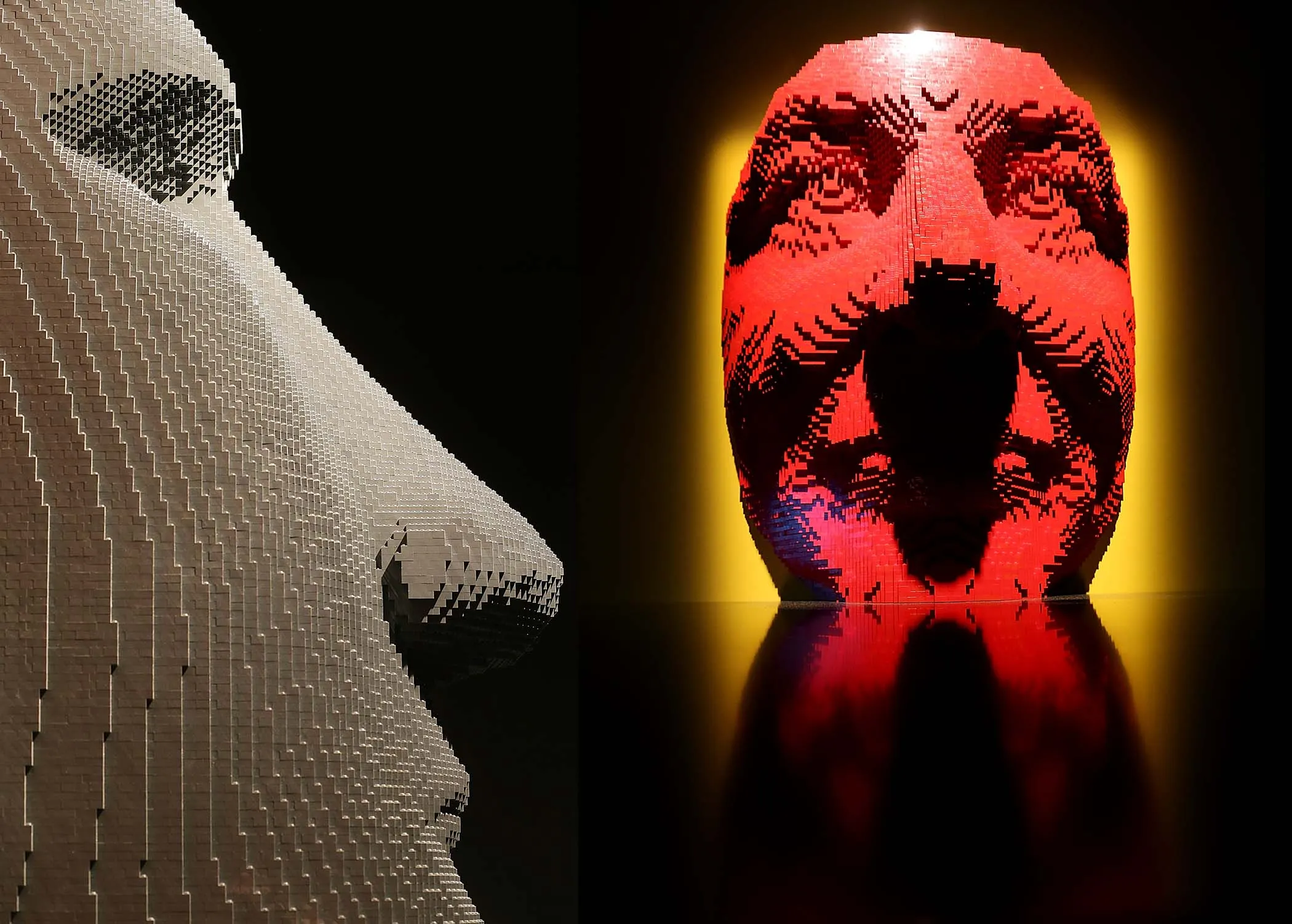“Moai” and “Facemask”, Nathan Sawaya sculptures, are displayed with others in the «Art of the Brick» show at Discovery Times Square in New York City, on June 18, 2013. Sawaya created the pieces entirely with LEGO toy bricks and the exhibition features over 100 works of art created from millions of the toy bricks. (Photo by Mario Tama/Getty Images)