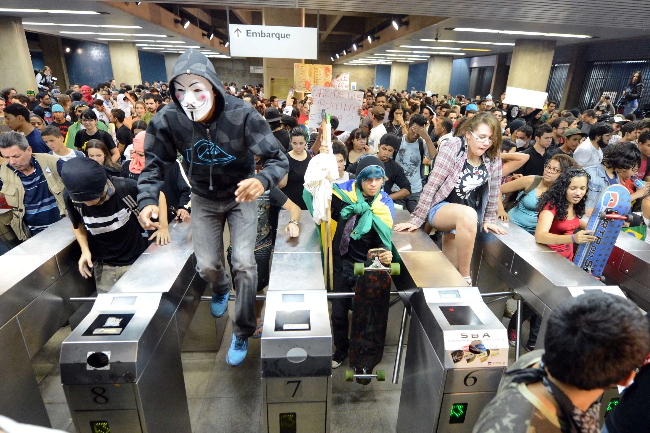 Students invade a subway station during a protest calling for a public transport free pass in the Federal District in Brasilia, on June 20, 2013. (Photo by Evaristo SA/AFP Photo)