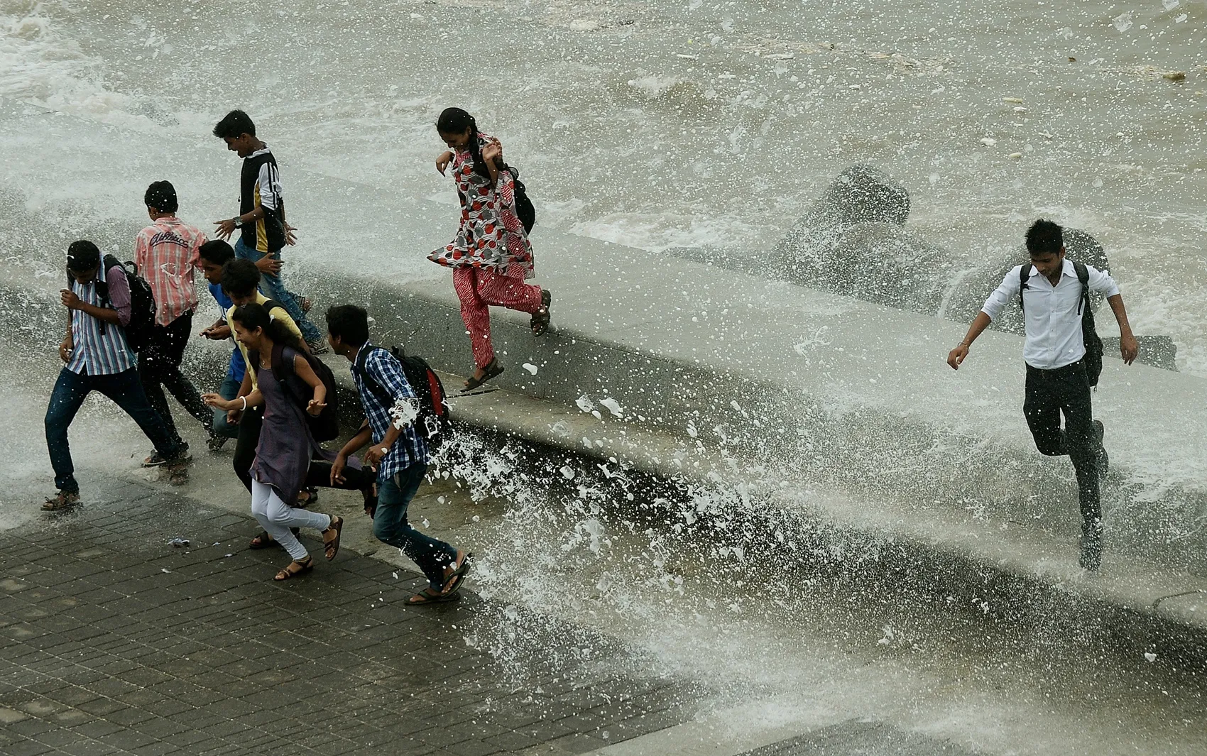 Indian pedestrians run from water splashing over a sea wall in Mumbai on June 24, 2013. The monsoon, which covers the subcontinent from June to September, usually brings some flooding. But the heavy rains arrived early this year, catching many by surprise and exposing a lack of preparedness. (Photo by Punit Paranjpe/AFP Photo)