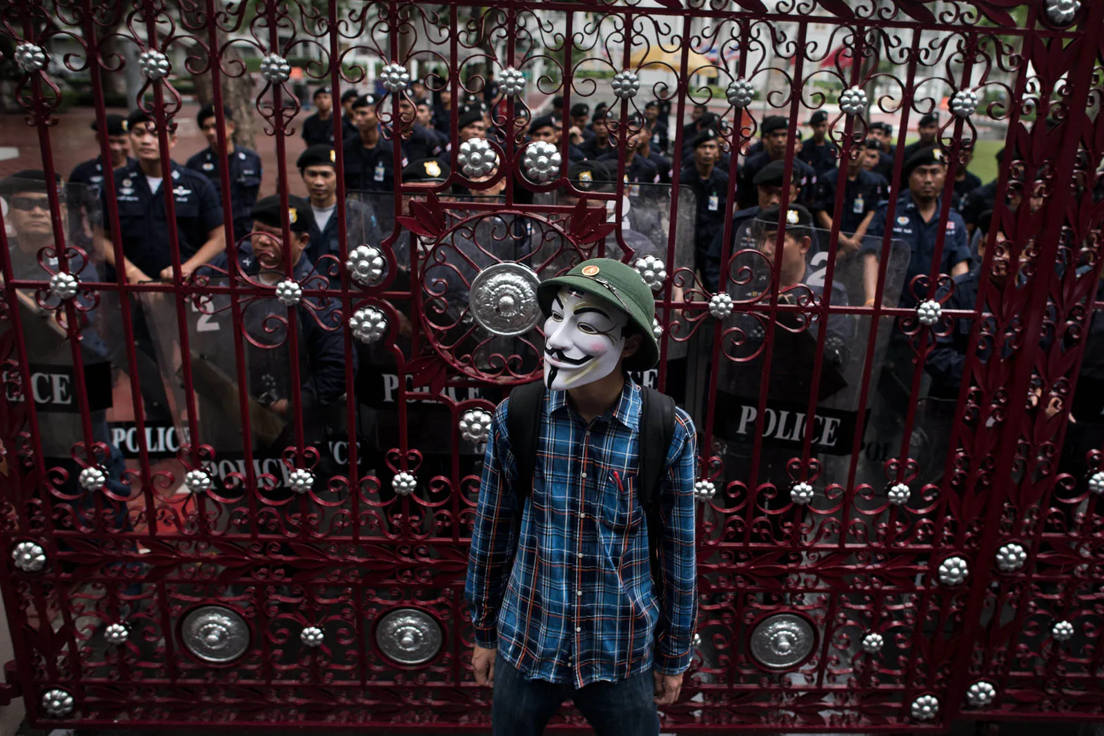 A protester wearing a Guy Fawkes mask, stand in front of a gate secured by Thai police officers as he and thousands of protesters gather in Bangkok's shopping district on June 23, 2013. Thousands of people marched through central Bangkok to protest against the former prime minister Thaksin Shinawatra and the current government led by his sister Thai Prime minister Yingluck Shinawatra. (Photo by Nicolas Asfouri/AFP Photo)