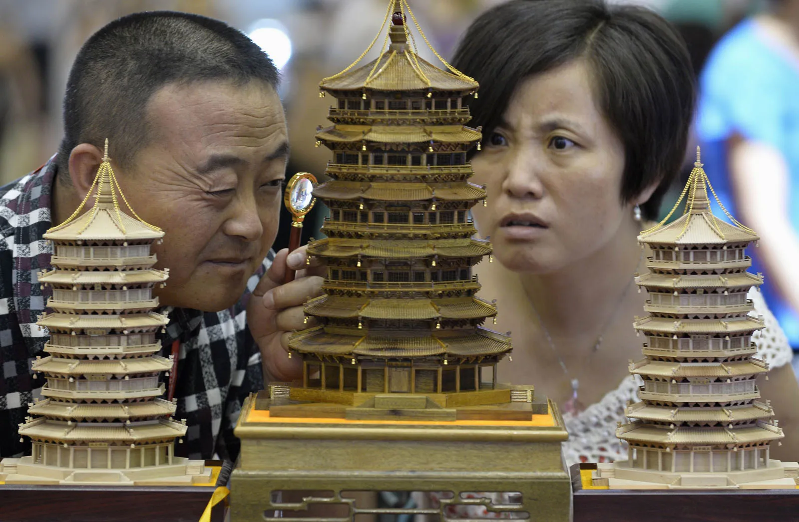 A visitor uses a magnifying glass to look at a handmade wood carving in the shape of a Chinese ancient pavilion at a culture industry exhibition in Taiyuan, Shanxi province July 2, 2013. (Photo by Jon Woo/Reuters)