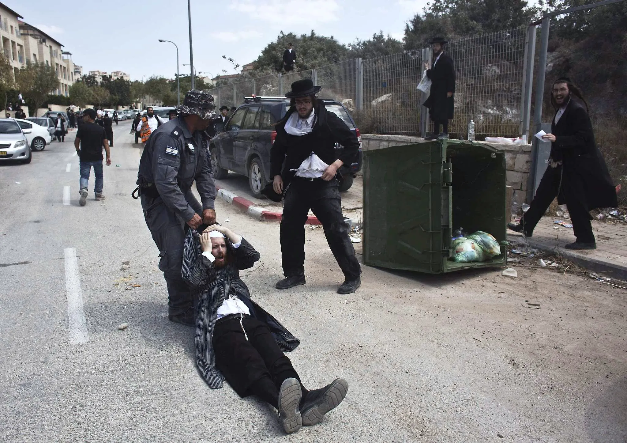 An Israeli policeman drags an ultra-Orthodox man during clashes in the town of Beit Shemesh, near Jerusalem August 12, 2013. An Israeli police spokesperson said some 21 ultra-Orthodox protesters were detained on Monday in the town during clashes with police after a group of them broke into a construction site to prevent work from taking place at the site they believe contains ancient graves. (Photo by Nir Elias/Reuters)