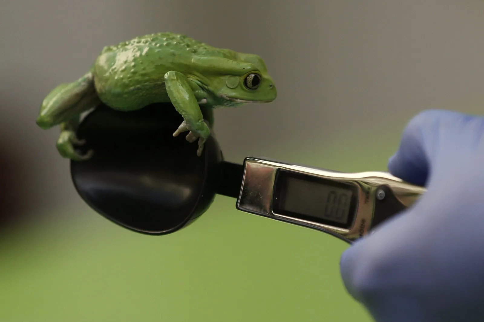 A zoo keeper weighs a waxy monkey frog during the annual weigh-in at London Zoo, London, Wednesday, August 21, 2013, where creatures are weighed and measured for their measurements to be recorded into the Zoological Information Management System (ZIMS). The frog weighted in at 40g. (Photo by Sang Tan/AP Photo)