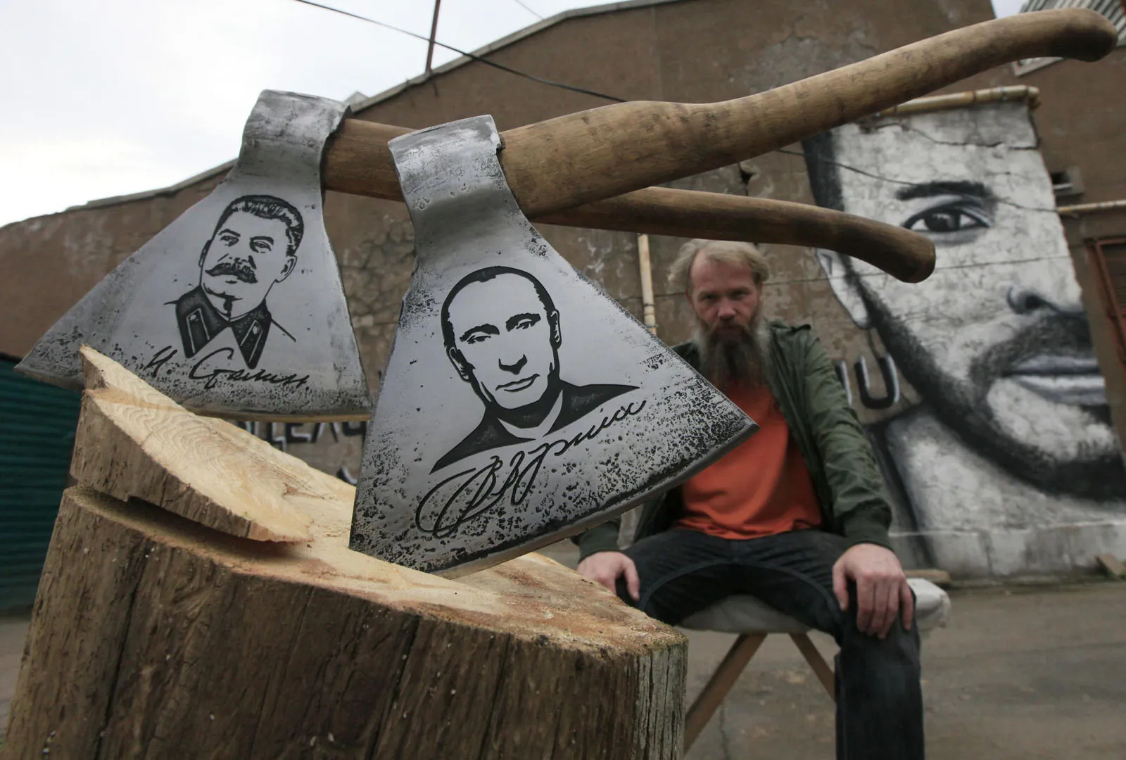 Russian artist Vasily Slonov poses for a picture with axes engraved with portraits of Russian President Vladimir Putin and Soviet leader Josef Stalin, during a presentation of his new art project “History of Russia, 20th century – from Lenin to Putin” at the courtyard of the Museum Center in Russia's Siberian city of Krasnoyarsk September 2, 2013. The artist has chemically engraved portraits of nine Soviet and Russian political figures on a series of butchers' axes. (Photo by Ilya Naymushin/Reuters)