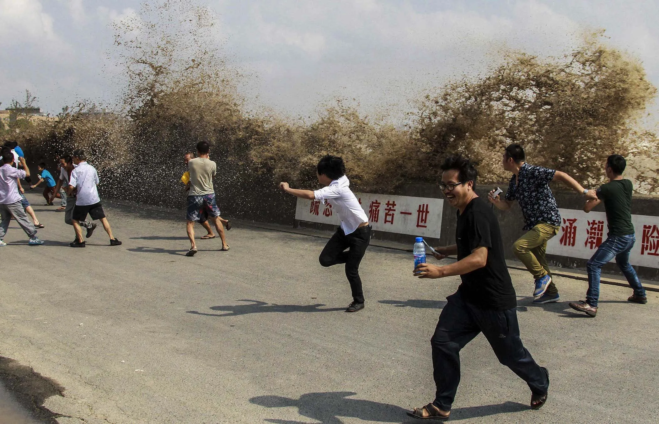 Visitors run away from a wave as it surges past a barrier on the banks of Qiantang River in Hangzhou, Zhejiang province, China, on September 20, 2013. (Photo by China Daily)