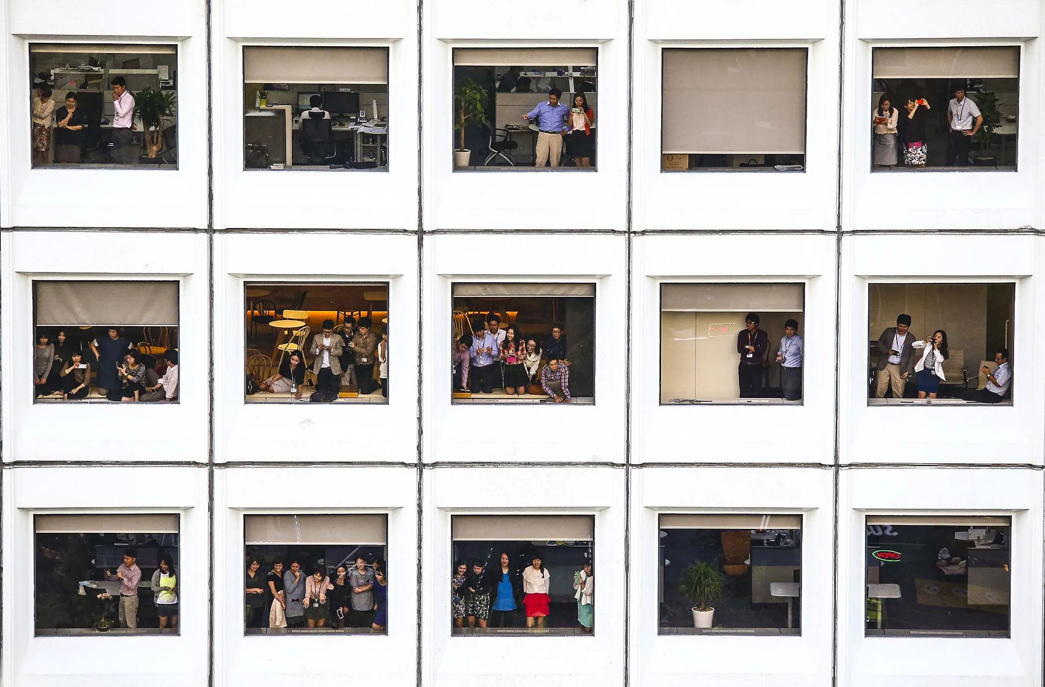 People in their offices watch South Korean troops during a military parade on a street during a ceremony to mark the 65th anniversary of Armed Forces Day in central Seoul, on October 1, 2013. (Photo by Kim Do-hun/Reuters/Yonhap)
