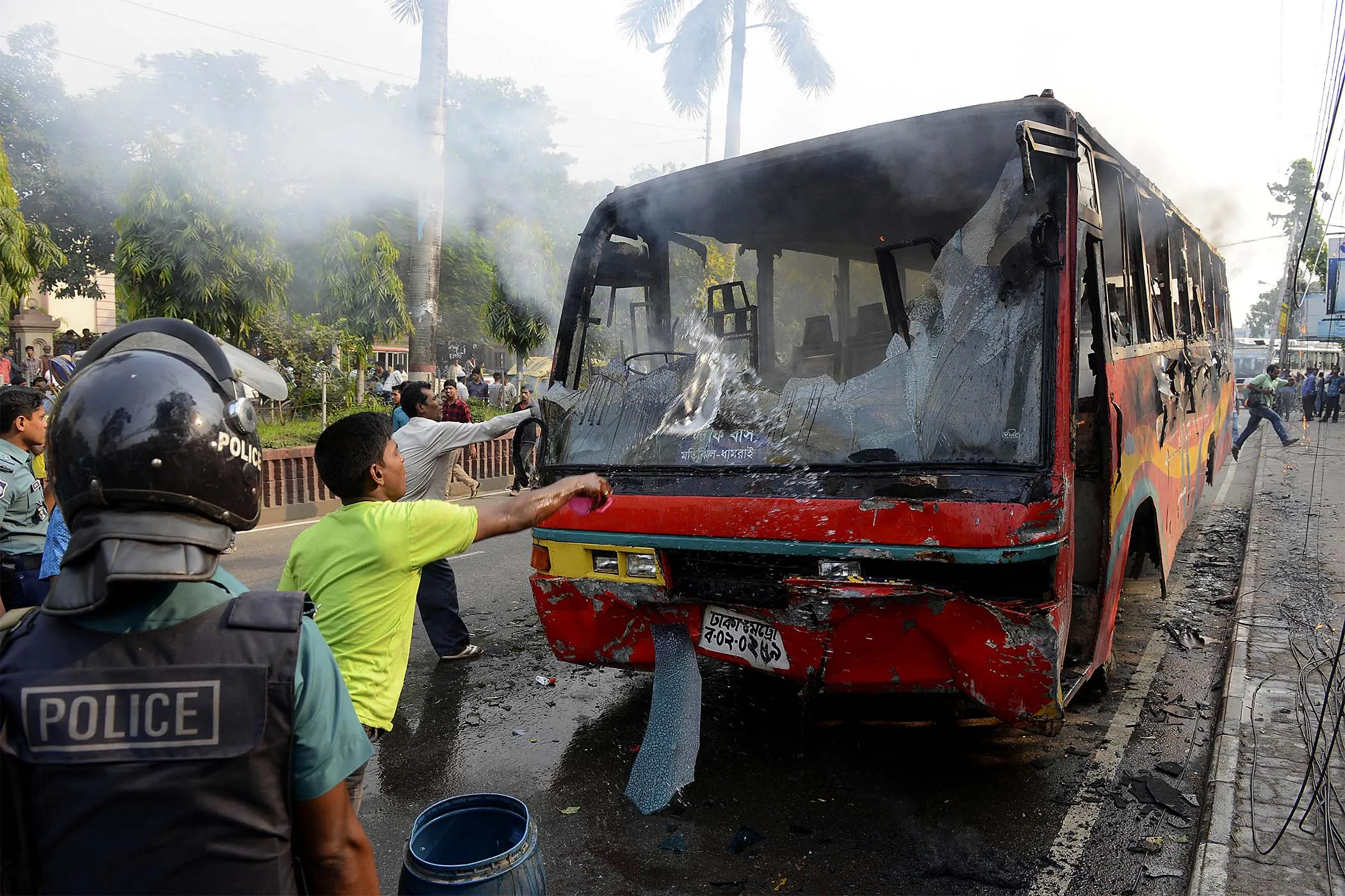 People try to douse the fire on a bus that was allegedly attacked by opposition activists in Dhaka, Bangladesh, on November 3, 2013. A special war crimes tribunal in Bangladesh on Sunday sentenced to death two Bangladeshis now living abroad for crimes against humanity during the country's independence war against Pakistan in 1971. The two men were members of the Jamaat-e-Islami Islamic party that is an ally of the country's main opposition Bangladesh Nationalist Party. (Photo by Associated Press)
