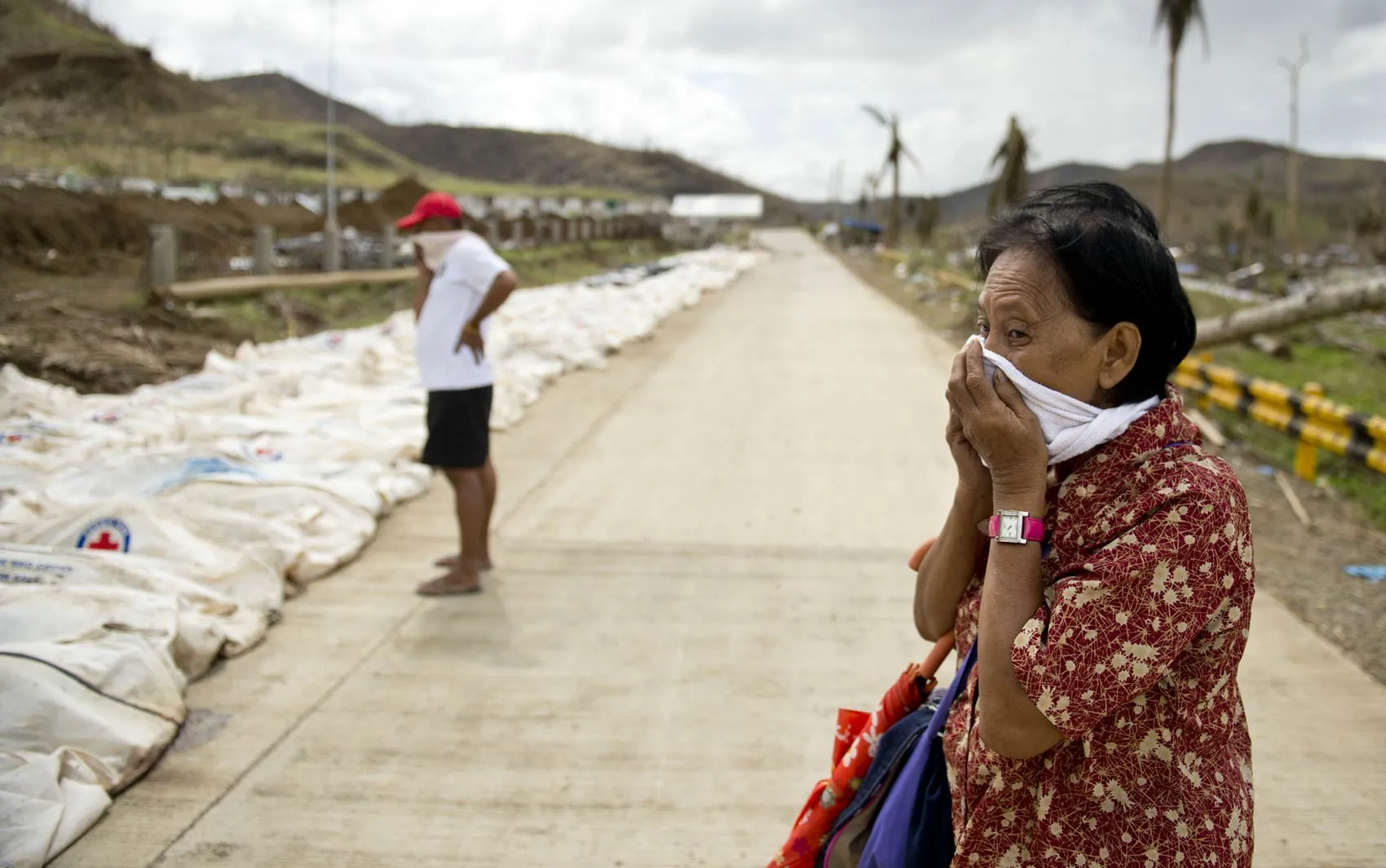 A woman covers her nose and mouth as she stopped to look at the body bags containing the remains of some 170 dead collected from the rubble at the “Cemetery of the hills”, one of three mass burial sites where they so far have received one thousand typhoon victims in Tacloban on November 19, 2013. Philippine President Benigno Aquino blamed the slow response to the ravages of Typhoon Haiyan on the total collapse of local government in the face of the storm's unprecedented destructive power. (Photo by Odd Andersen/AFP Photo)