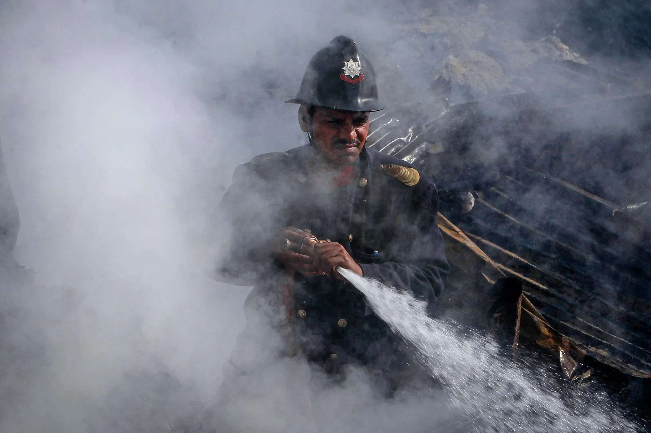 A firefighter tries to extinguish a fire in a slum area in Mumbai, on November 21, 2013. Several huts were gutted in the fire but no casualties were reported and the cause is unknown. (Photo by Danish Siddiqui/Reuters)