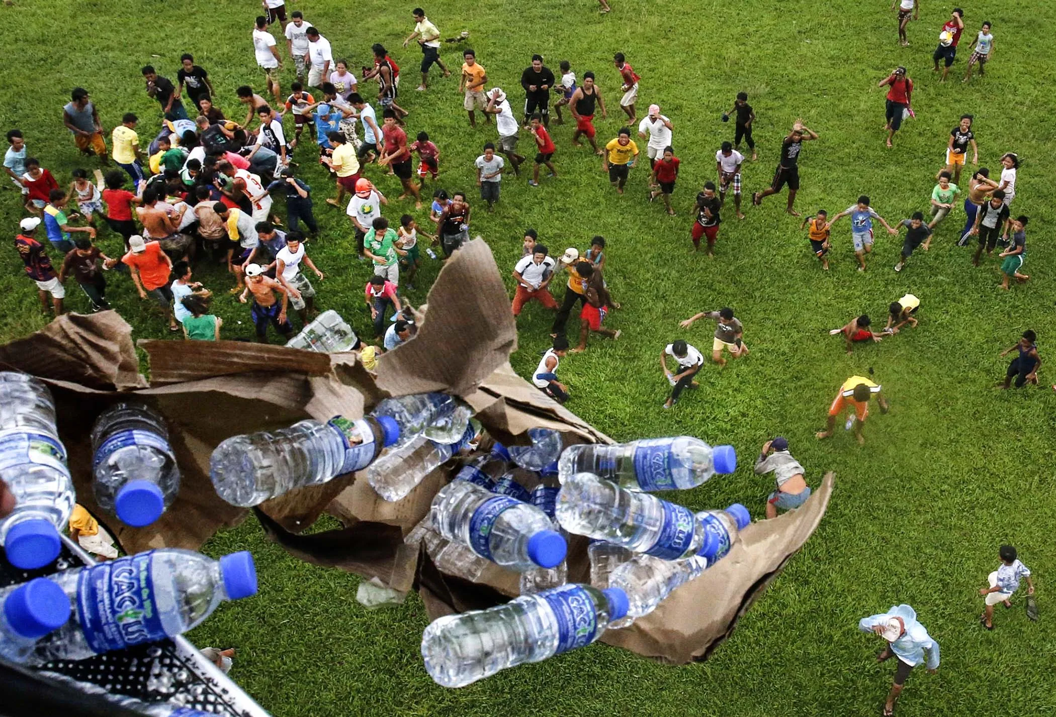 A Philippine military helicopter drops bottled water to Typhoon Haiyan survivors in Tolosa, Leyte in central Philippines, on November 21, 2013. The typhoon Haiyan has killed at least 4,000 people and reducing most of what was in its path to matchwood and rubble. Bodies are still being pulled from the debris. (Photo by Erik De Castro/Reuters)
