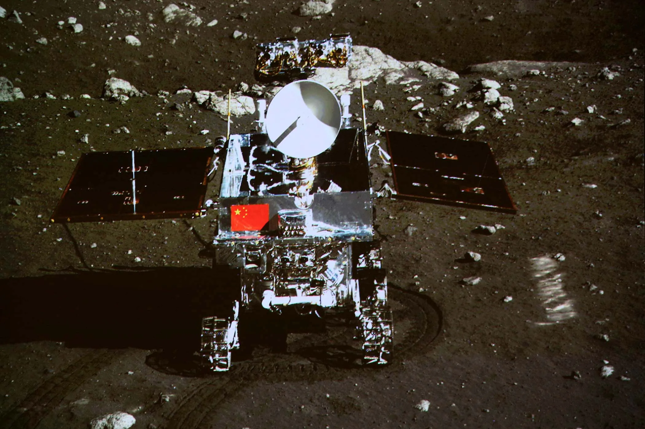 In this image taken by the on-board camera of the lunar probe Chang'e-3 and made off the screen of the Beijing Aerospace Control Center in Beijing, China's first moon rover “Yutu” – or Jade Rabbit – is on the lunar surface in the area known as Sinus Iridum (Bay of Rainbows). Yutu touched down on the moon and left deep traces on its loose soil, state media reported Sunday, several hours after the country successfully carried out the world's first soft landing of a space probe on the moon in nearly four decades. (Photo by Xinhua)