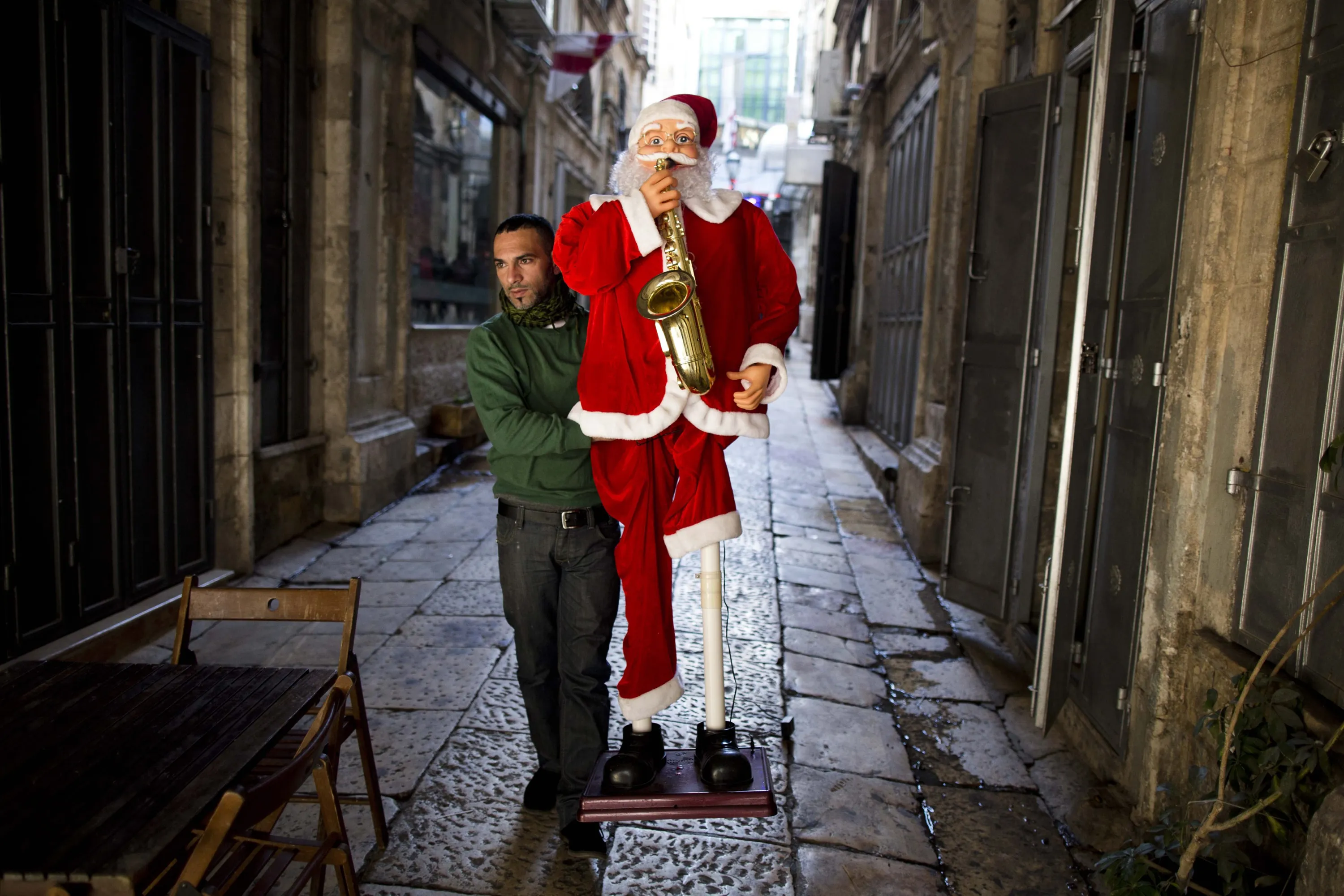 A Palestinian shop owner carries a Santa Claus figure on the street preparing for the Christian holiday of Christmas near Jaffa Gate in the Old City of Jerusalem, Israel, 19 December 2013. (Photo by Abir Sultan/EPA)