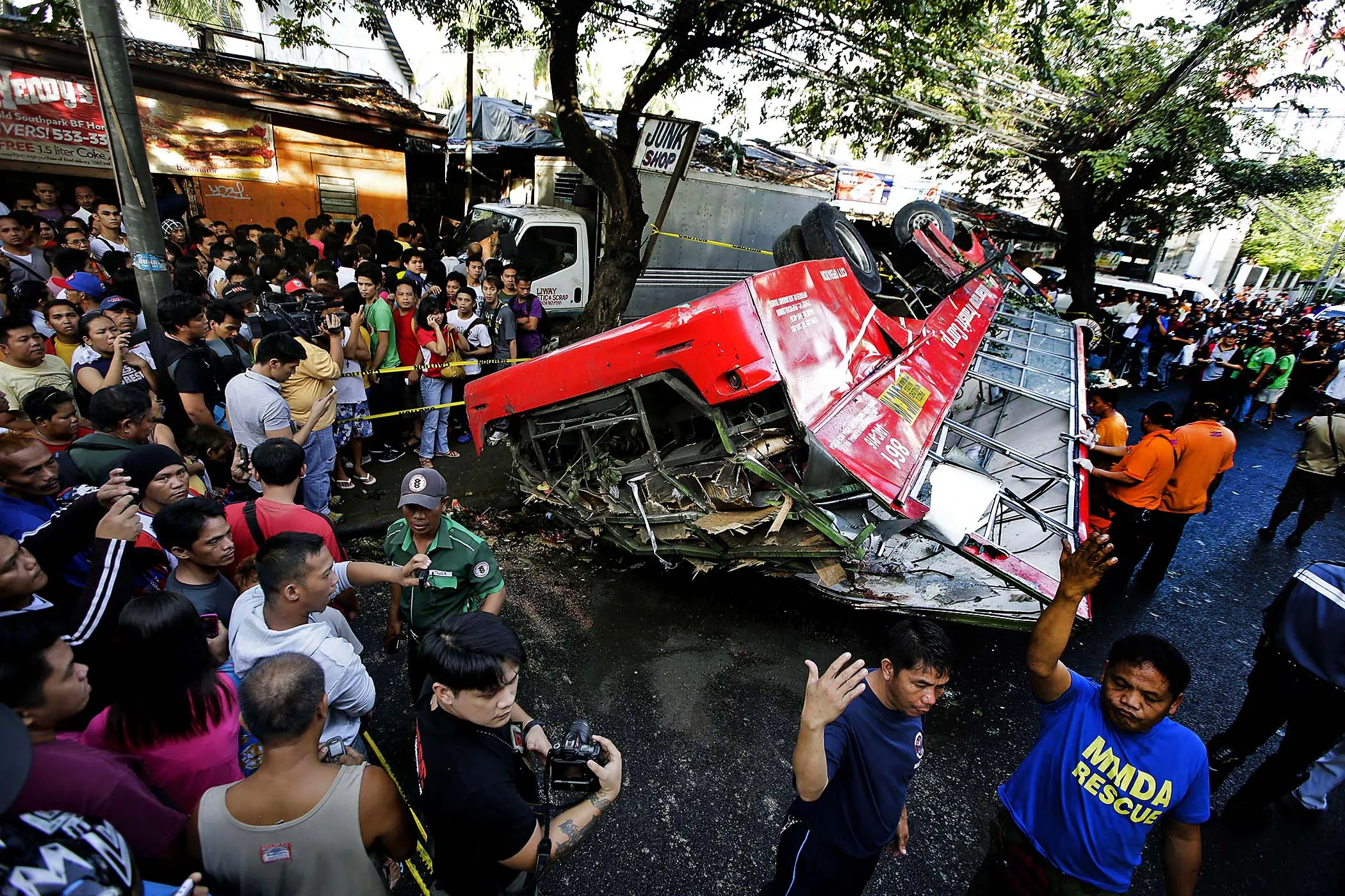 People gather at the scene where a passenger bus plunged from an elevated highway known as the Skyway, in suburban Paranaque, southeast of Manila, Philippines, on December 16, 2013. Officials said at least 21 people died, mostly passengers, and more than 20 others were injured in the accident. (Photo by Bullit Marquez/Associated Press)