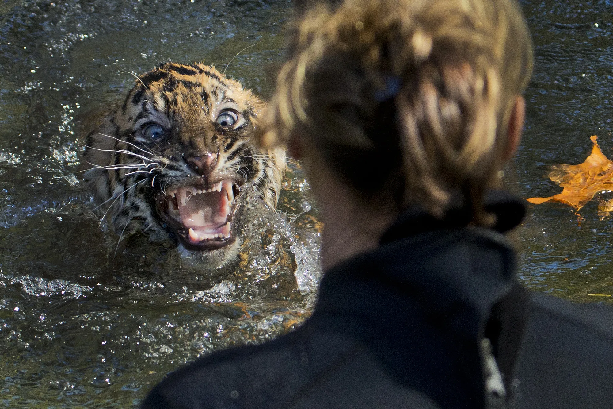 A three-month-old Sumatran tiger cub named “Bandar” shows his displeasure after being dunked in the tiger exhibit moat for a swim reliability test at the National Zoo in Washington, Wednesday, November 6, 2013. (Photo by Manuel Balce Ceneta/AP Photo)