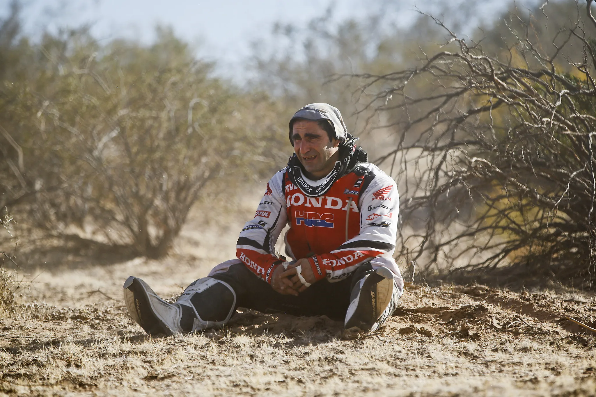 Honda rider Paulo Goncalves of Portugal weeps as he sees his motorcycle on fire during the fifth stage of the Dakar Rally between the cities of Chilecito and San Miguel de Tucuman, Argentina, Thursday, January 9, 2014. (Photo by Victor R. Caivano/AP Photo)