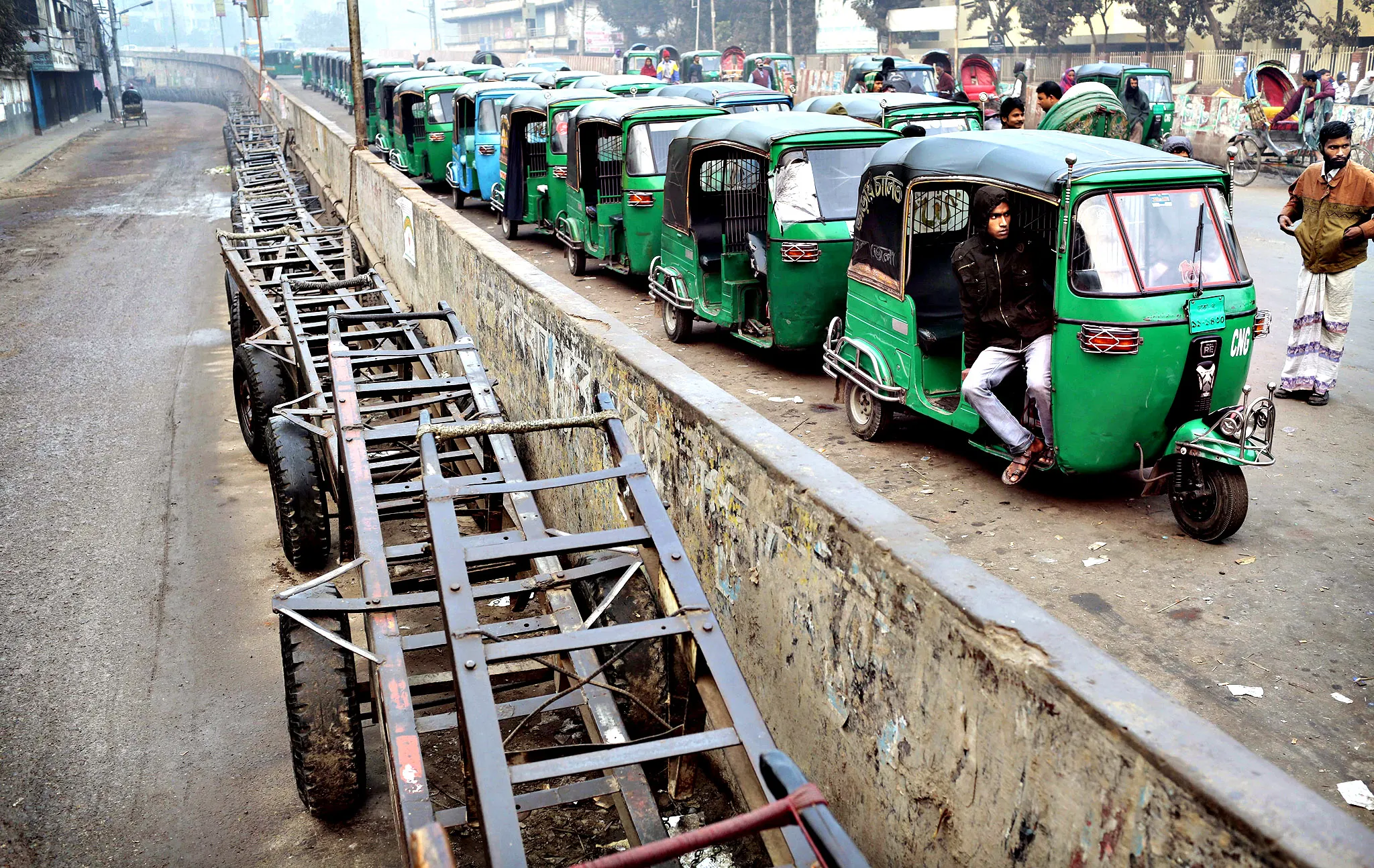 A Bangladeshi auto driver waits for passengers during an ongoing strike called by the main opposition Bangladesh Nationalist Party (BNP) in Dhaka, Bangladesh, Tuesday, January 7, 2014. On Monday, Bangladesh's Prime Minister Sheikh Hasina's ruling Awami League party won one of the most violent elections in the country's history, marred by street fighting, low turnout and a boycott by the opposition that made the results a foregone conclusion. The political gridlock plunges Bangladesh deeper into turmoil and economic stagnation, and could lead to more violence in a deeply impoverished country of 160 million. (Photo by A. M. Ahad/AP Photo)