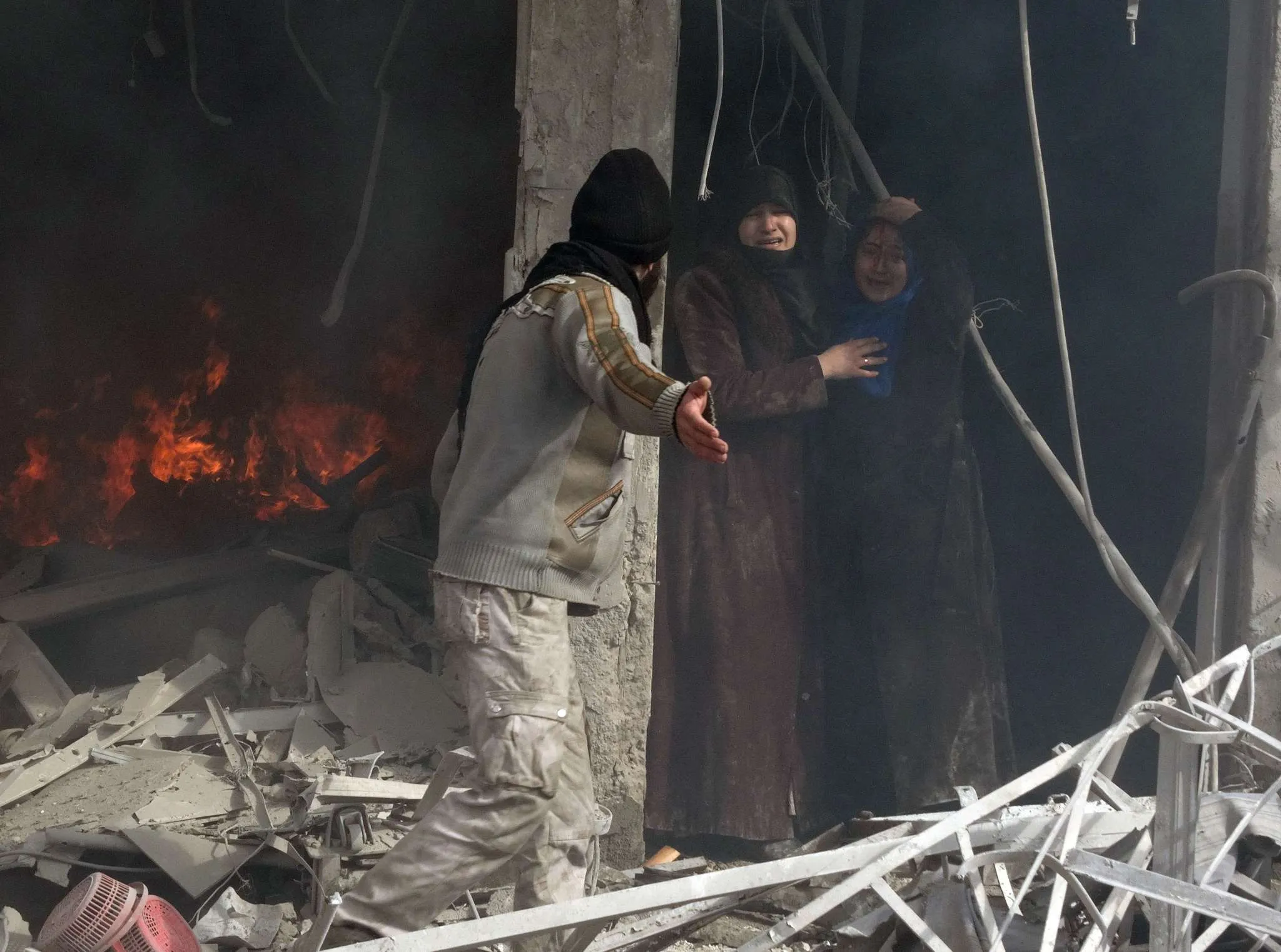 A man shows the way to two Syrian women as they leave a building following an alleged air strike by Syrian government forces on January 30, 2014 in the northern Syrian city of Aleppo. Syria's government has razed thousands of homes as “collective punishment” of communities that back the opposition in the capital Damascus and in Hama province, Human Rights Watch said. (Photo by Mohammed Al-Khatieb/AFP Photo)