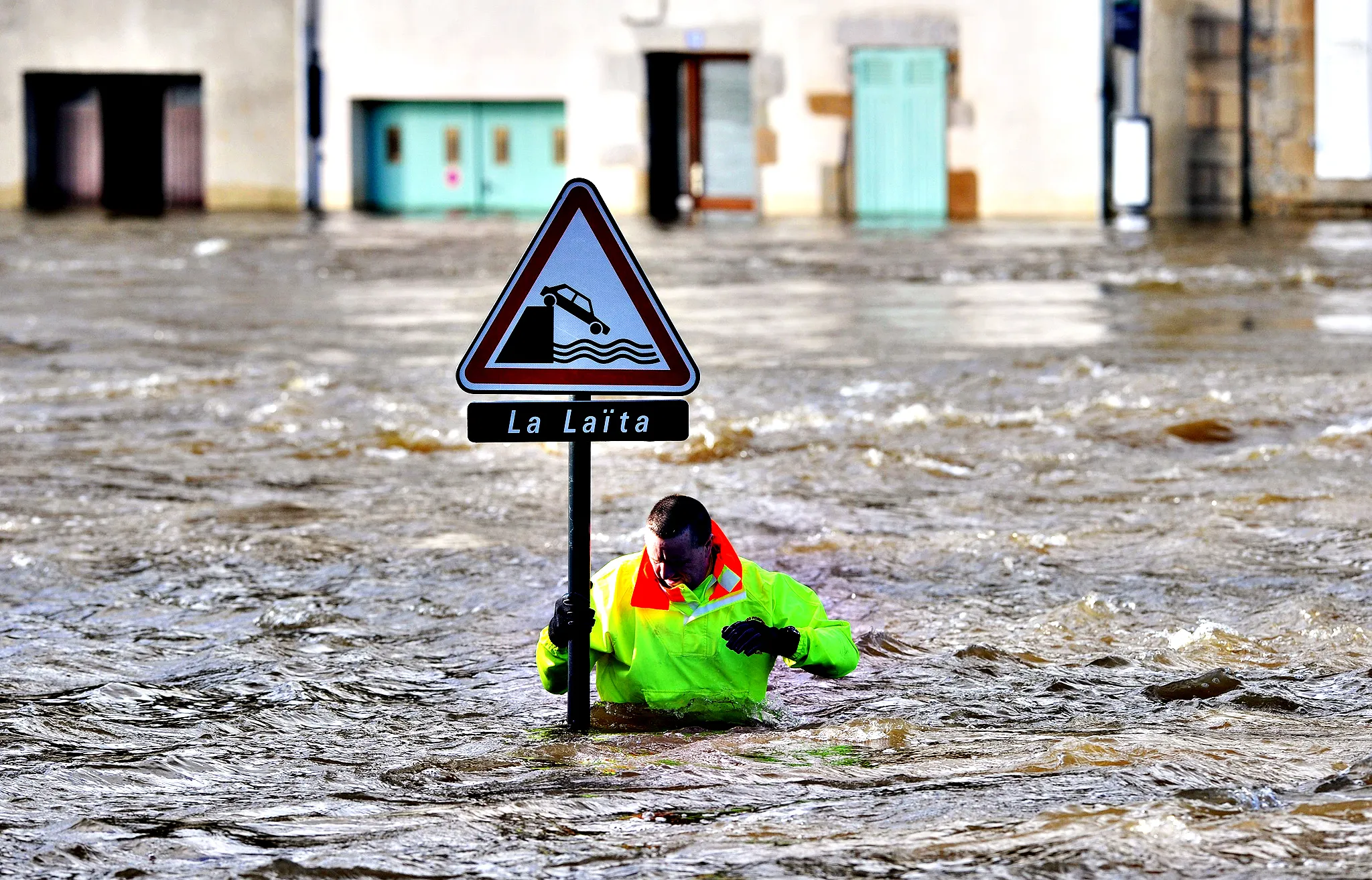 A rescuer checks a signpost in a street flooded by the coastal river Laita in the city center of Quimperle, western France on February 7, 2014. 90 houses in Quimperle were flooded by the coastal river Laitia, which is expected to rise above 4,50 meters. Northwestern France has been hit by the winter storm Qumeira on February 6 and 7, with 36 French departments rising their alert level, notably in the Finistere. (Photo by Frank Perry/AFP Photo)